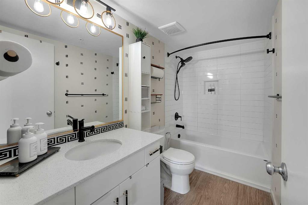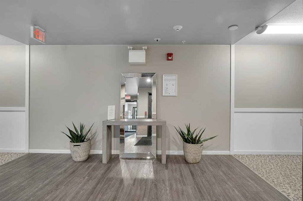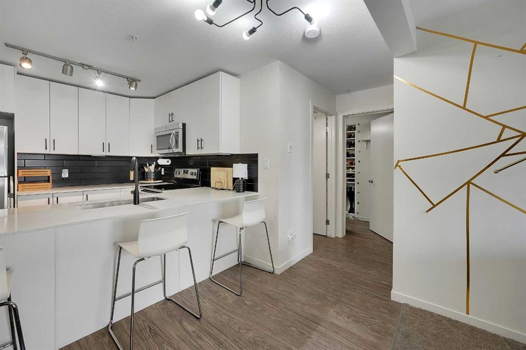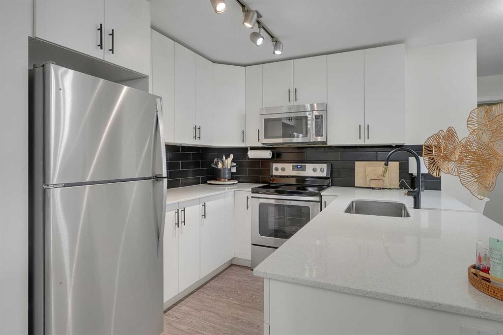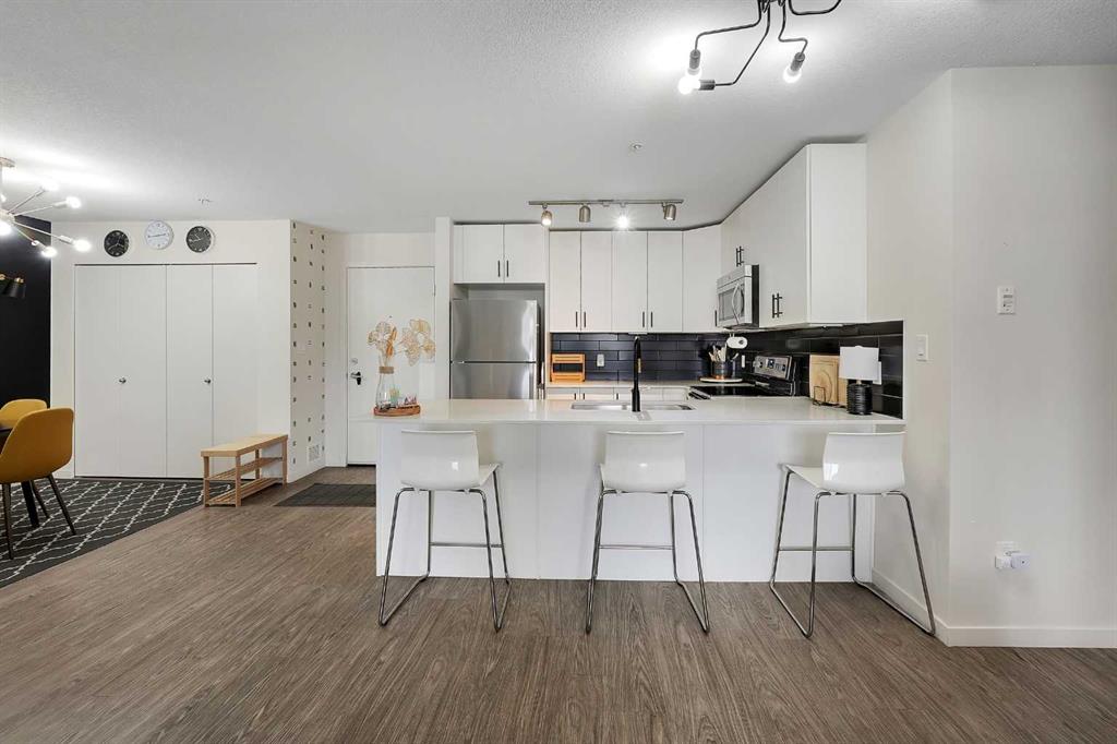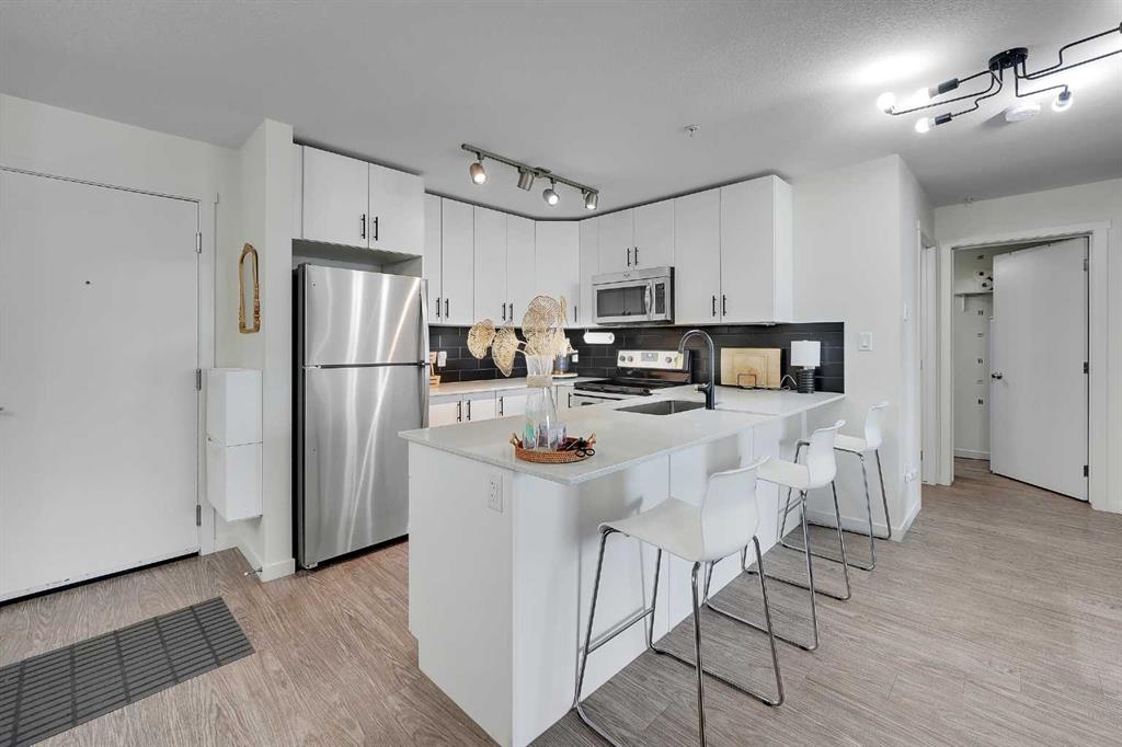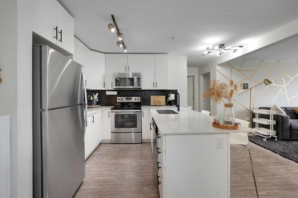 Step into this bright, open-concept sanctuary where modern comfort meets an amenity-rich lifestyle at McCall Landing. This meticulously maintained home welcomes you with a seamless blend of durable laminate flooring and plush carpet, elevated by a suite of upgrades that truly set it apart. The kitchen features upgraded new backsplash, a gourmet sink, and sleek high-arc faucets. The bathroom is refreshed with a new bathtub and contemporary fixtures. Designer lighting throughout the dining, living, and sleeping areas creates a warm, sophisticated ambience, while smart storage solutions; including integrated laundry shelving and expanded closet systems in both bedrooms. Your morning coffee will taste better on the private balcony where unobstructed views offer a peaceful escape from the city bustle. Peace of mind is built right in with triple-pane windows and advanced noise-reduction engineering in the floors and walls, making this one of the quietest buildings in the Northeast. Beyond your front door, the McCall Landing advantage gives you exclusive access to a private fitness centre, a vibrant community lounge for hosting, a community garden with dedicated grow beds, and even a fenced dog run for your furry companions. Complete with a heated underground parking spot and seamless access to Stoney Trail, the Airport, and the diverse shops of Skyview, this move-in-ready gem is the perfect opportunity for those who refuse to compromise on quality. Book your showing today!