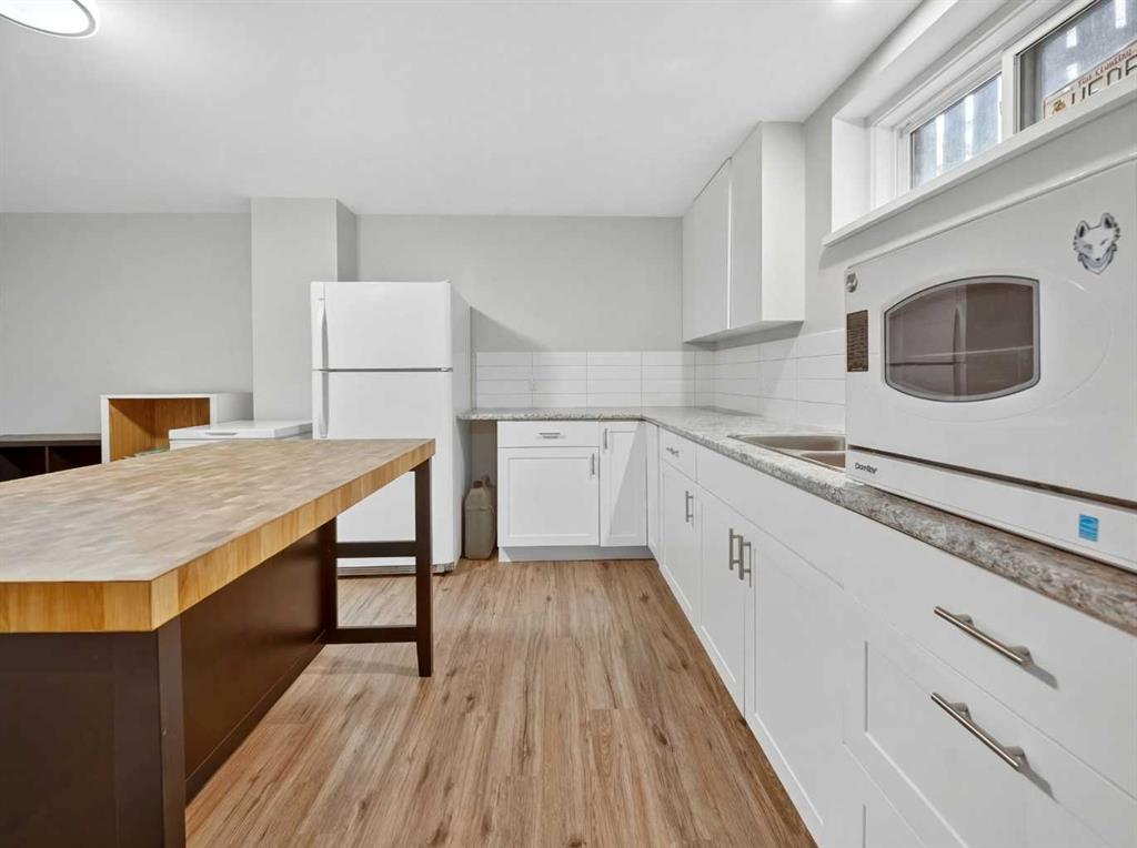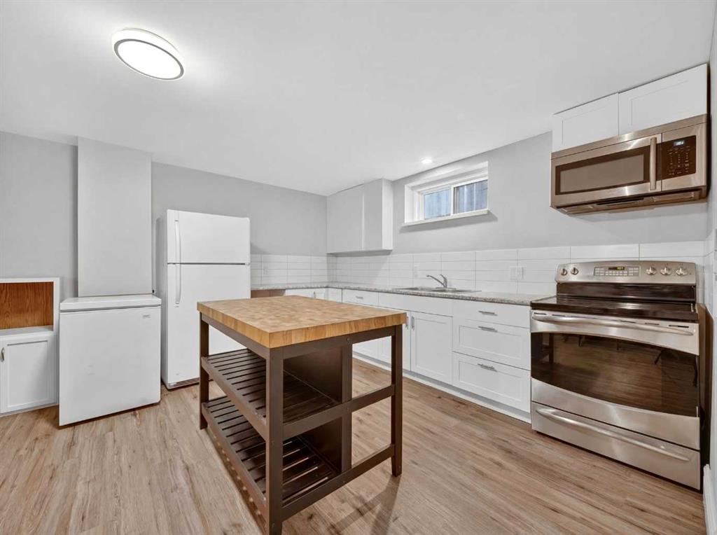 The main floor features rich hardwood flooring, two spacious bedrooms plus a dedicated office, and a stylish 4-piece bathroom. The renovated kitchen is both functional and elegant, complete with quartz countertops, a gas stove, and ample cabinetry — ideal for everyday living and entertaining. A cozy wood-burning fireplace anchors the living space, adding warmth and character.