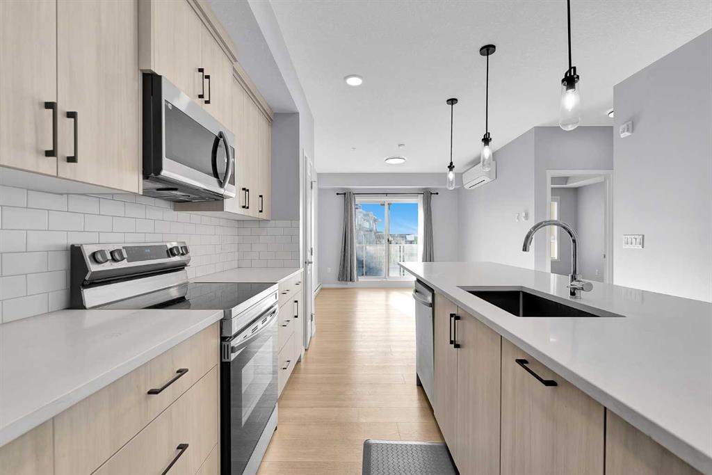 The stylish kitchen is the heart of the home, showcasing quartz countertops, stainless steel appliances, ample cabinetry, an elegant backsplash, and a central breakfast island. The kitchen flows seamlessly into the dining area and inviting living room, creating an ideal space for both everyday living and entertaining.