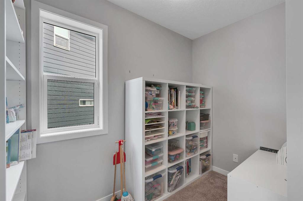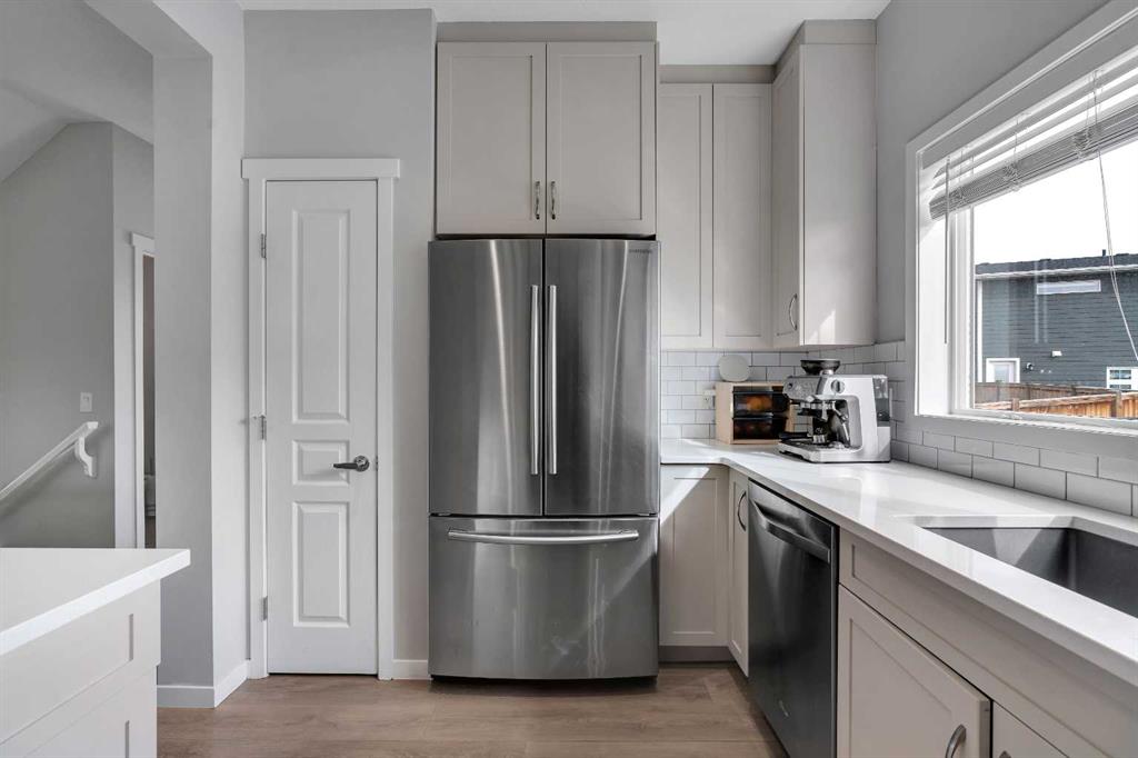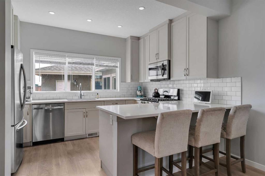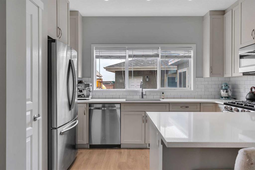 Welcome to Marquis Court! This air-conditioned, fully developed home offers over 2,200 sq. ft. of developed living space, plus a separate backyard office. The main floor features 9-ft ceilings, luxury vinyl plank flooring, and an upgraded kitchen with pot lighting, extended cabinetry, quartz countertops, white subway tile backsplash, stainless steel appliances including a gas range, a pantry, and a peninsula island with seating. The kitchen opens to a spacious dining area with an added window for extra natural light. The family room is bright and inviting, and an additional flex space provides room for a home office or whatever suits your needs. A functional mudroom with a storage bench and closet, along with a powder room, completes the main level. Upstairs, you’ll find a spacious primary bedroom with a walk-in closet and a well-appointed ensuite featuring an oversized tiled shower, double sinks, quartz countertops, and a soaker tub. There are two additional bedrooms—one with a walk-in closet and one with a closet organizer—along with the main bathroom and a convenient upper-floor laundry room with extra cabinetry and a hanging bar. The builder-developed basement includes a large rec room, bedroom, full bathroom, and plenty of additional storage. A standout feature is the separate backyard office, complete with electricity, heat, and air conditioning—an ideal work-from-home setup. The oversized backyard offers a large deck, double garage, and plenty of space to enjoy. Located just steps from the wetlands in the award-winning lake community of Mahogany, you’ll enjoy year-round amenities including beaches, skating, paddleboarding, walking paths, and parks, along with nearby schools, shopping, restaurants, and all essential services just minutes away.