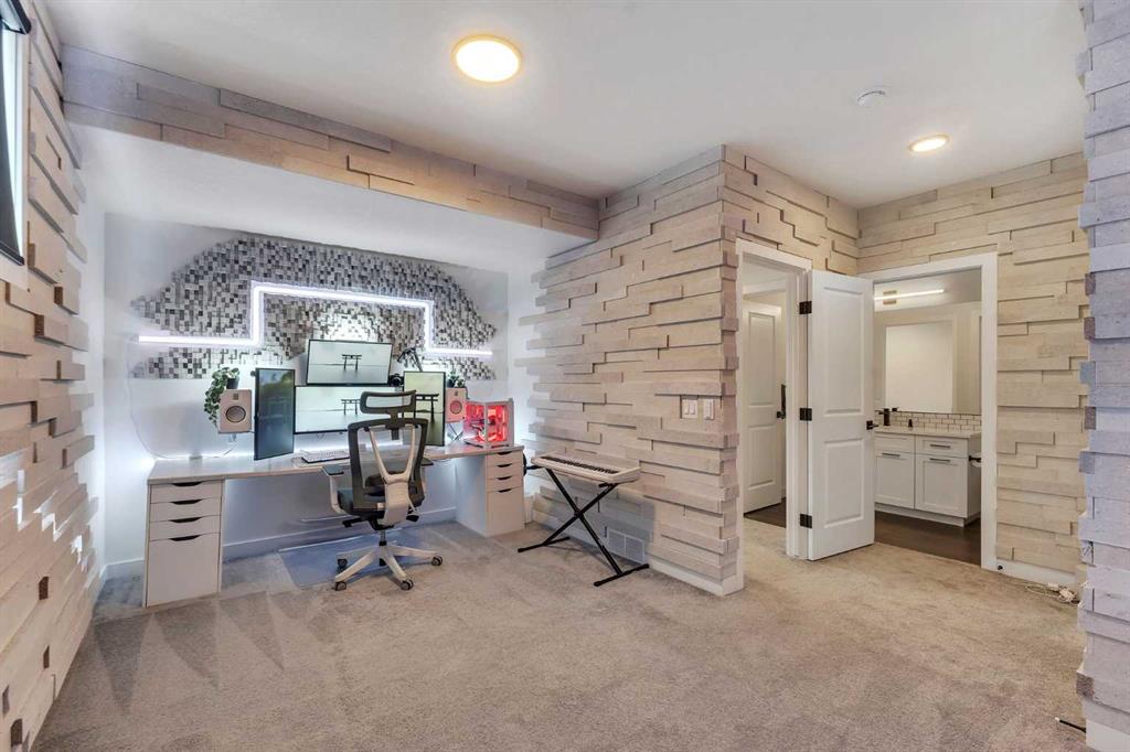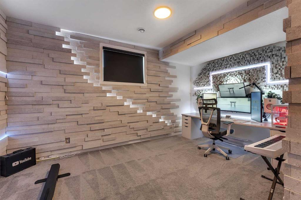The fully finished walkout basement is designed for entertainment and comfort, anchored by a stylish bar and large recreation room, plus a unique bedroom featuring $7,000+ worth of acoustic panels with built-in lighting—the perfect personal getaway. A full bathroom, utility room with a second set of laundry machines, and ample storage complete the lower level.