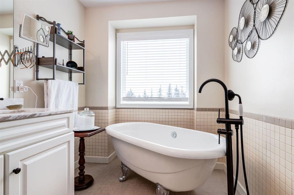 Upstairs, the primary suite is a true retreat. It features a deep bay window with a seating area where you can watch the sunset over the mountains. The ensuite feels like a high-end spa, complete with double sinks, marble tops, a walk-in shower, and a classic clawfoot tub with a floor-mounted spout. The two additional bedrooms are perfect for kids or guests, one even featuring a sweet built-in window seat with extra storage.