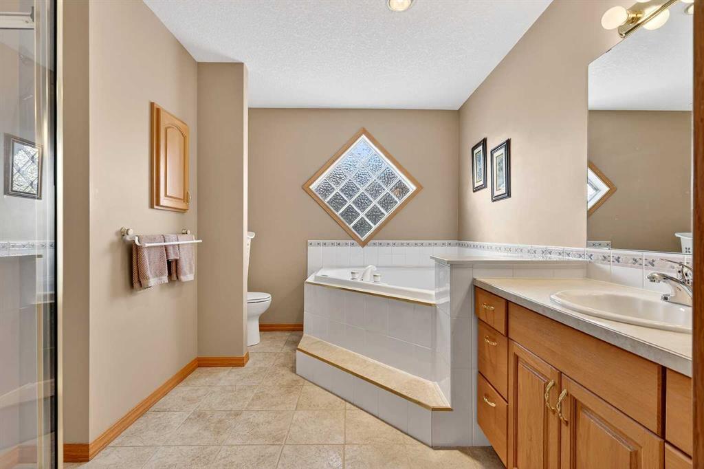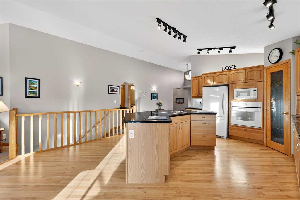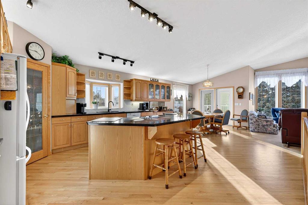 2 GARAGES – FULLY DEVELOPED WALK OUT – RV PARKING! This BUNGALOW is a contractor built personal residence that is thoughtfully designed, solidly built, and meticulously maintained. It is perfectly situated on large CORNER LOT in a desirable, mature neighborhood offering a total of 2983.7 sq ft of above & below grade developed living space, 2 GARAGES, RV PARKING, VAULTED CEILINGS, CENTRAL A/C, multi-zoned IN-FLOOR BOILER HEAT SYSTEM, loads of NATURAL LIGHT, abundant STORAGE, CENTRAL VACUUM, and WALK OUT basement! From the moment you step into the heated tile entrance, you are invited into a bright, open-concept floor plan characterized by soaring vaulted ceilings and an abundance of natural light. You seamlessly transition onto hardwood floors and into the gorgeous open living area that serves as the heart of the home. Here in the kitchen, you’ll find a massive granite top island with built-in cooktop, ample cabinetry, corner pantry, and full suite of appliances which then flows into the dining area designed for large family gatherings. Step out garden doors onto the tiled balcony, the perfect perch for morning coffee, evening cocktail and a GAS BBQ for summer grilling. The carpeted living room boasts floor-to-ceiling windows equipped with REMOTE-CONTROLLED BLIND SYSTEM and a GAS FIREPLACE creating the perfect spot for a cozy evening. Set to the side, the main primary retreat is equally as impressive, offering space for king-sized furniture, huge WALK-IN CLOSET, and well-appointed FOUR-PIECE ENSUITE with relaxing JETTED TUB. Completing the main level is the bright, dedicated Office at front, convenient two-piece guest bath, and main floor laundry room with 1 piece bath. There is direct access from laundry room to the double attached garage, which stays toasty year-round thanks to in-floor heating system. The lower level is a FULLY DEVELOPED WALK-OUT that feels like a natural extension of the bright upper floor. It features a massive rec/family room with custom wood entertainment center perfect for movie nights and additional space for game table or home gym. Two additional large bedrooms and a four-piece bathroom provide plenty of space for family or guests, while another versatile room offers the potential for a fifth bedroom, hobby or office space. Storage is never an issue here, with a dedicated room featuring built-in shelving and a chest freezer, with yet another storage room tucked beneath the stairs. The exterior of the property is just as impressive as you step out through garden doors onto the covered patio out to a landscaped yard, complete with mature trees and flower beds, and an underground sprinkler system to keep the grounds lush. Car enthusiasts, hobbyists, or tradesmen will be thrilled by the additional detached heated single garage with alley access, complimented by paved RV parking pad eliminating additional storage fees. MOVE-IN READY with QUICK POSSESSION available! Note: owner has the only neighboring vacant lot for sale as well.