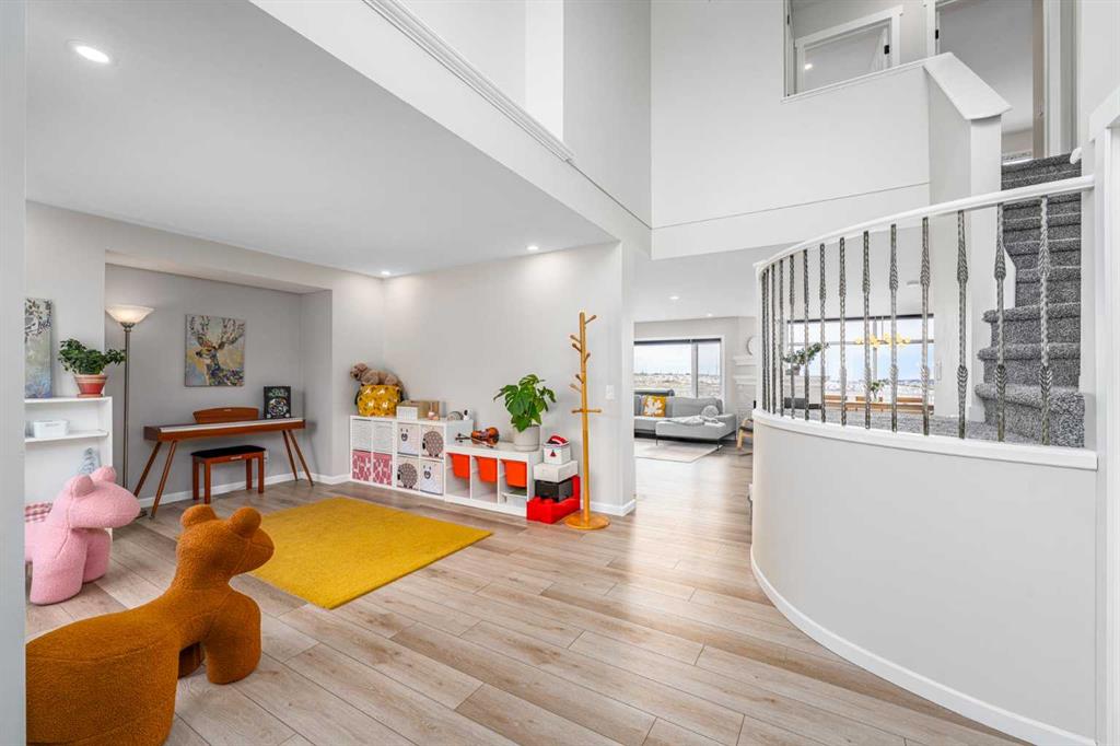 Step inside and you are immediately greeted by a soaring open-to-above ceiling and an elegant curved staircase railing that creates a grand and upscale first impression. To the left of the entrance is a private office, perfect for working from home or creating a quiet study space.