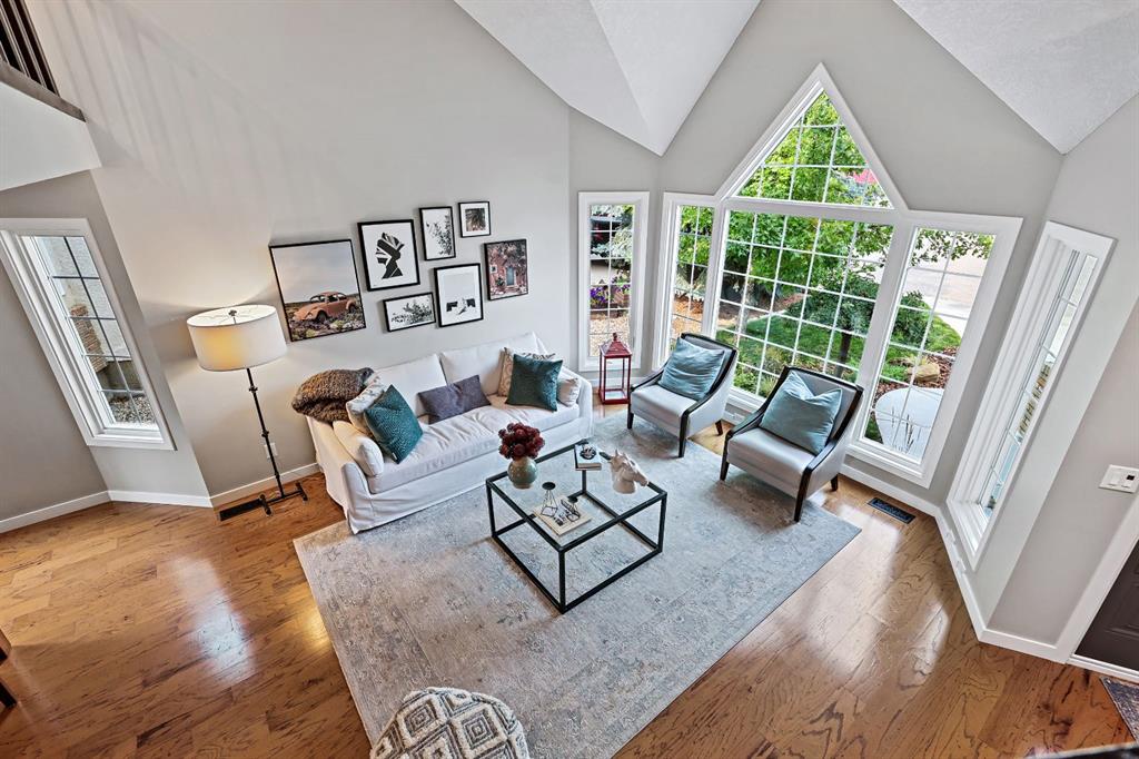 The main floor features vaulted ceilings and expansive windows that frame the mountain skyline and flood the home with natural light. Hardwood flooring runs through the formal living and dining areas, anchored by a family room with gas fireplace. The kitchen includes granite countertops, island seating, and brand new KitchenAid stainless steel appliances overlooking the backyard. A dedicated mudroom and laundry complete the level.