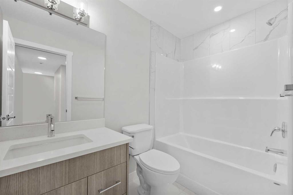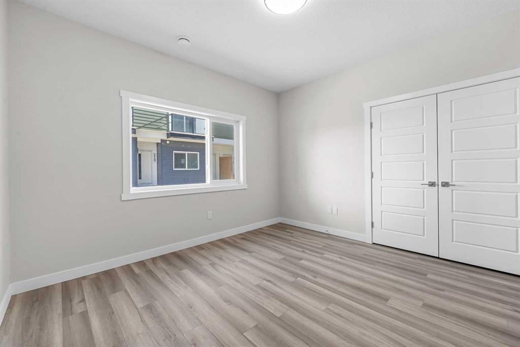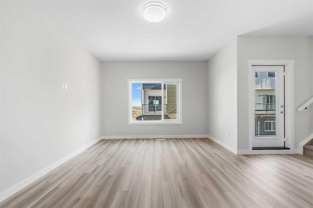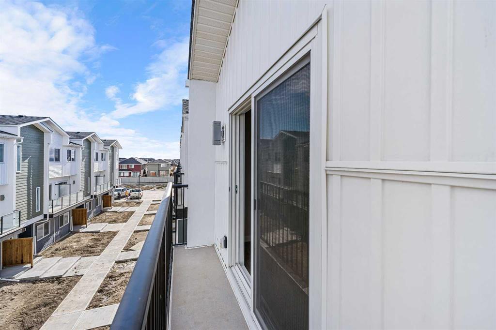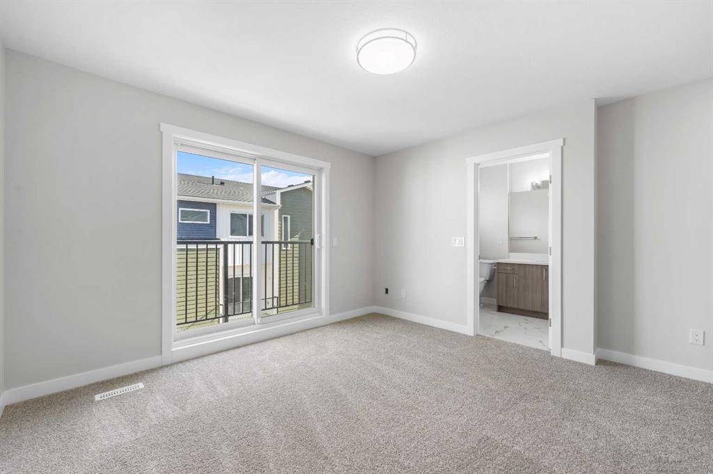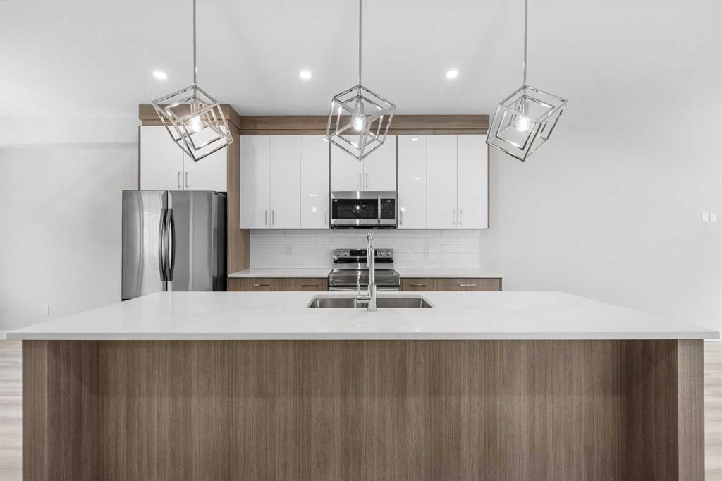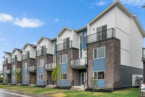 End Unit | Front of the Complex | Brand New | 3-Storey Townhome | Double Attached Garage | 4 Bedrooms | 3.5 Bathrooms | Main Level Bachelor Pad with Wet Bar | Modern Finishes | Quartz Countertops | Gloss Finished Full Height Upper Cabinets | Stainless Steel Appliances | Soft Closed Drawers & Cabinets | Stacked Front Loading Washer & Dryer | Energy Saving High Performance Windows | Private Balcony | Keyless Pad Garage | Private Walkway to Front Door | Exterior Privacy Walls. This townhome is finished with an open concept, modern design and a functional open floor plan to complement your lifestyle. Step inside the front door to a foyer with access to the double attached garage and the first primary bedroom of this 3-storey townhome. The main floor bedroom is designed for individual living. This large bedroom is outfitted with a wet bar with built-in cabinets above & below, a sink and space for appliances. This bedroom is paired with a 4pc ensuite bath with a tub/shower combo. The 2nd level is home to the open and bright main living space that incorporates kitchen, dining and living room. The kitchen features 36″ upper cabinets, quartz countertops, soft close cabinets & drawers and a grand centre island with barstool seating. Across from the island are two pantries for dry goods storage! Off the kitchen is a spacious dedicated dining area. Next is the home office/den. This space is an added bonus for anyone with a work from home lifestyle or a space for overnight guests. The frosted french doors provide privacy while keeping the space airy and welcoming. The grand living room is expansive and inviting for when you host friends and family! The living room is complimented with a glass door that leads to your West facing balcony with lighting and a gas line for a BBQ. The balcony is partnered with a frosted glass privacy screen. This level is complete with a 2pc bathroom. The upper level holds 3 grandiose bedrooms and 2 bathrooms. The first is a spacious primary bedroom featuring a deep walk-in closet and its very own 3pc ensuite with a walk-in shower. Bedrooms 2 & 3 are mirrored images of each other with great lighting and closet space. The main 4pc bath has a tub/shower combo. Convenient upper level hall laundry near the bedrooms is a bonus! A home with great value and low condo fees to ensure you receive exemplary services at reasonable prices. The location also places you in the highly sought after brand new community of Redstone with quick access to Stoney Trail for your daily commute. This complex will have a centred greenspace courtyard and ample visitor parking! Design, features and finishings may not be exactly as shown. The actual layout may be a mirror image of the layout shown here. *Photos are from unit 110 Red Sky Villas. Hurry and book your showing to secure yourself a brand new townhome today!