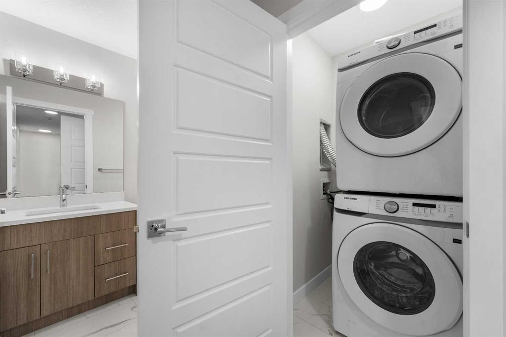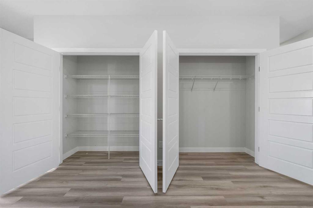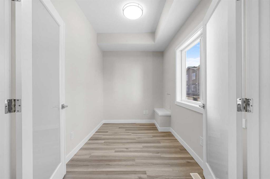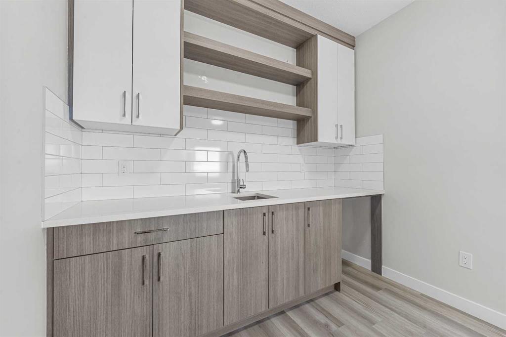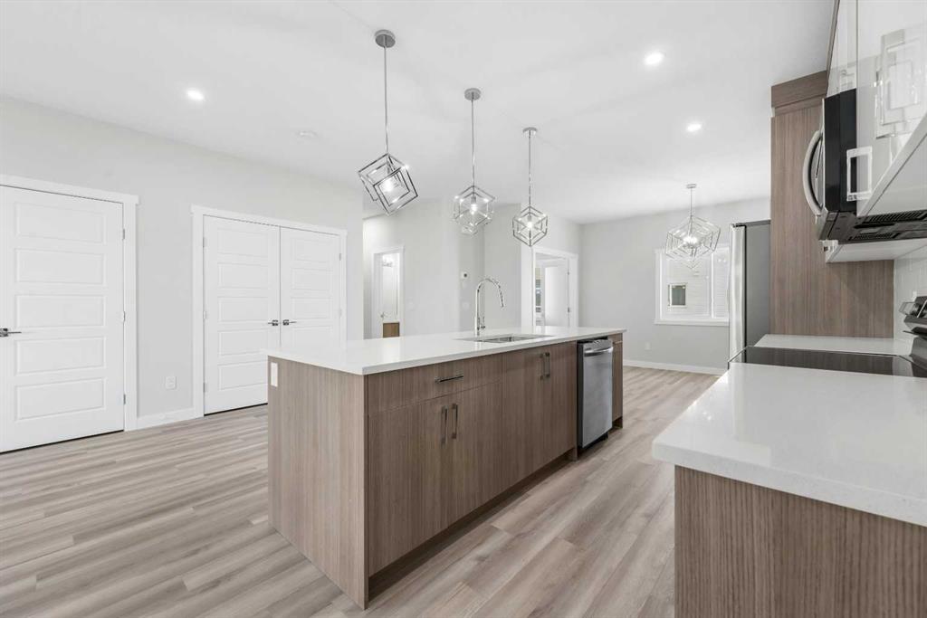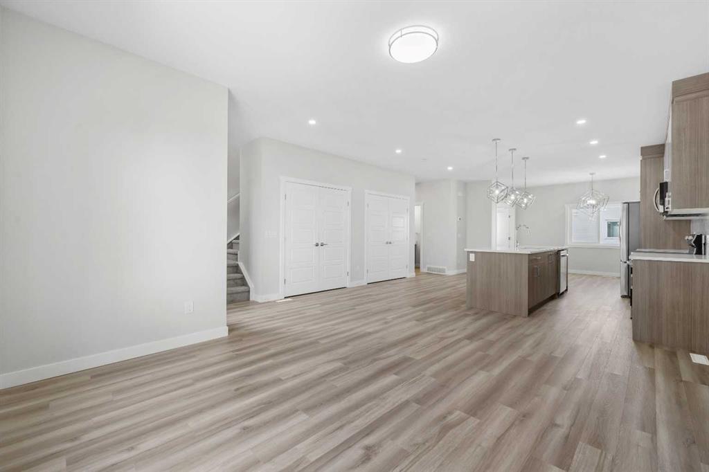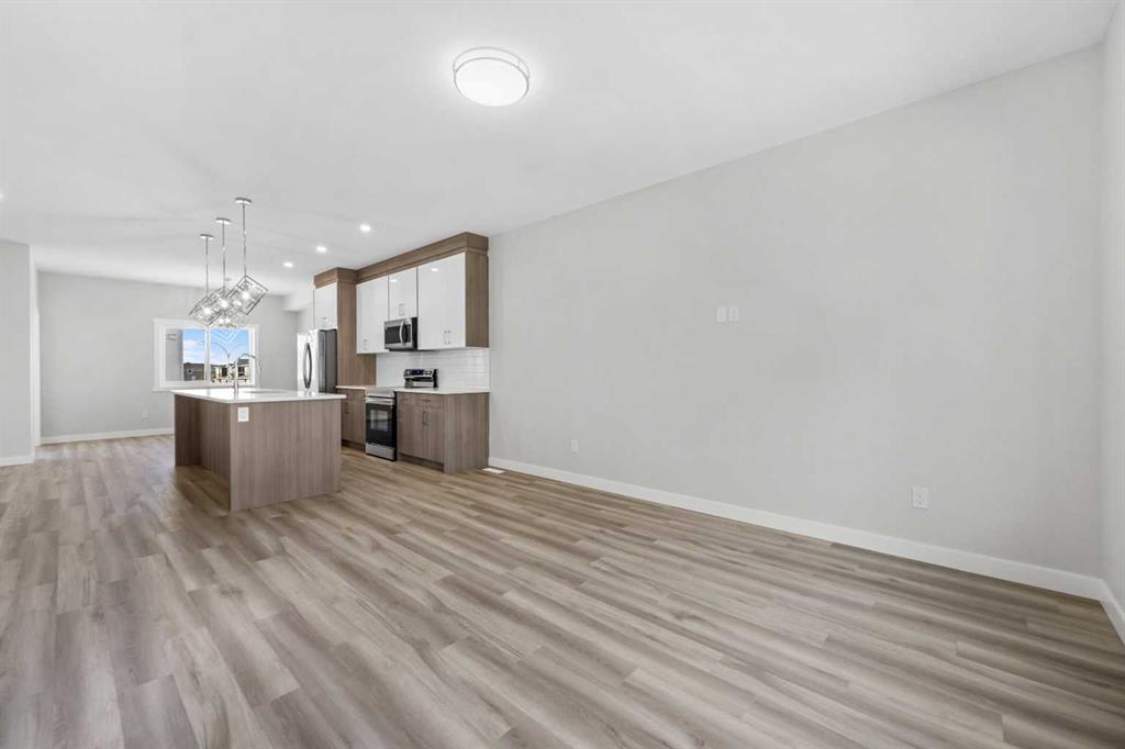 End Unit | Front of the Complex | Brand New | 3-Storey Townhome | Double Attached Garage | 4 Bedrooms | 3.5 Bathrooms | Main Level Bachelor Pad with Wet Bar | Modern Finishes | Quartz Countertops | Gloss Finished Full Height Upper Cabinets | Stainless Steel Appliances | Soft Closed Drawers & Cabinets | Stacked Front Loading Washer & Dryer | Energy Saving High Performance Windows | Private Balcony | Keyless Pad Garage | Private Walkway to Front Door | Exterior Privacy Walls. This townhome is finished with an open concept, modern design and a functional open floor plan to complement your lifestyle. Step inside the front door to a foyer with access to the double attached garage and the first primary bedroom of this 3-storey townhome. The main floor bedroom is designed for individual living. This large bedroom is outfitted with a wet bar with built-in cabinets above & below, a sink and space for appliances. This bedroom is paired with a 4pc ensuite bath with a tub/shower combo. The 2nd level is home to the open and bright main living space that incorporates kitchen, dining and living room. The kitchen features 36″ upper cabinets, quartz countertops, soft close cabinets & drawers and a grand centre island with barstool seating. Across from the island are two pantries for dry goods storage! Off the kitchen is a spacious dedicated dining area. Next is the home office/den. This space is an added bonus for anyone with a work from home lifestyle or a space for overnight guests. The frosted french doors provide privacy while keeping the space airy and welcoming. The grand living room is expansive and inviting for when you host friends and family! The living room is complimented with a glass door that leads to your West facing balcony with lighting and a gas line for a BBQ. The balcony is partnered with a frosted glass privacy screen. This level is complete with a 2pc bathroom. The upper level holds 3 grandiose bedrooms and 2 bathrooms. The first is a spacious primary bedroom featuring a deep walk-in closet and its very own 3pc ensuite with a walk-in shower. Bedrooms 2 & 3 are mirrored images of each other with great lighting and closet space. The main 4pc bath has a tub/shower combo. Convenient upper level hall laundry near the bedrooms is a bonus! A home with great value and low condo fees to ensure you receive exemplary services at reasonable prices. The location also places you in the highly sought after brand new community of Redstone with quick access to Stoney Trail for your daily commute. This complex will have a centred greenspace courtyard and ample visitor parking! Design, features and finishings may not be exactly as shown. The actual layout may be a mirror image of the layout shown here. *Photos are from unit 110 Red Sky Villas. Hurry and book your showing to secure yourself a brand new townhome today!