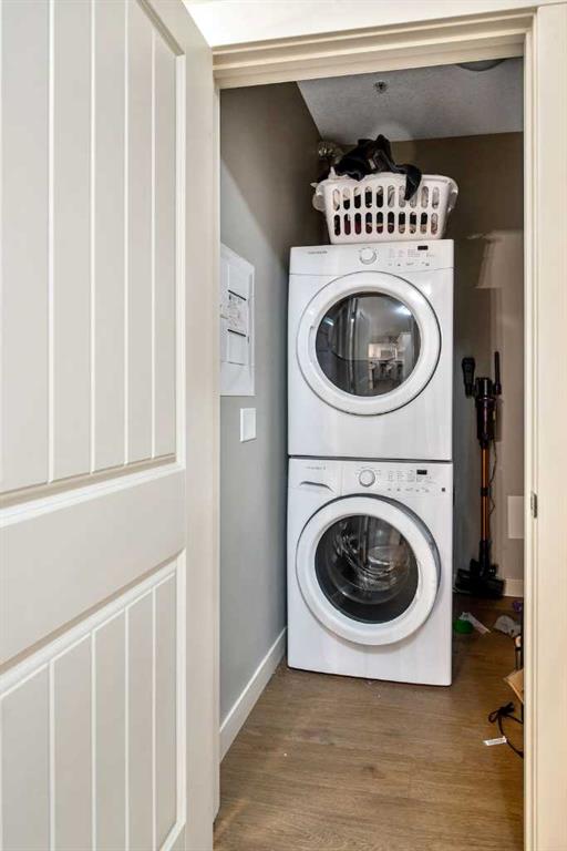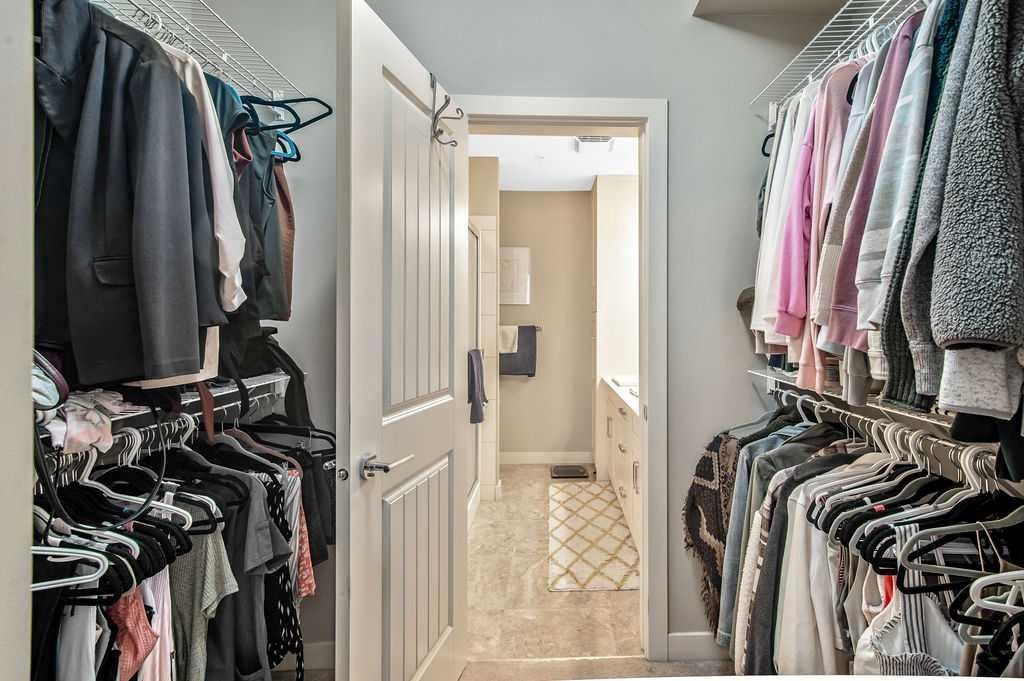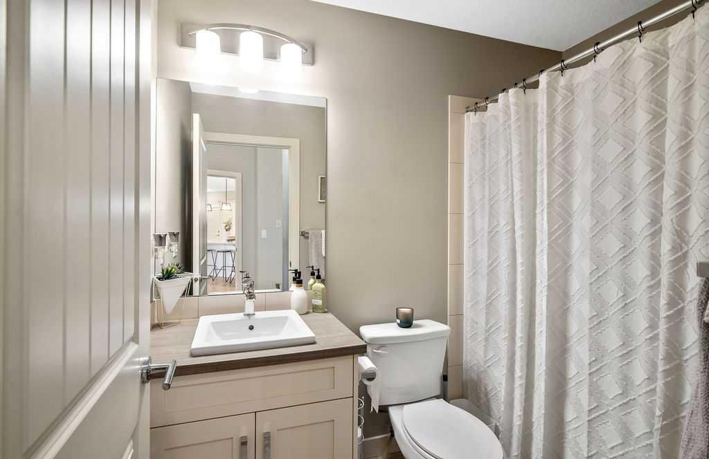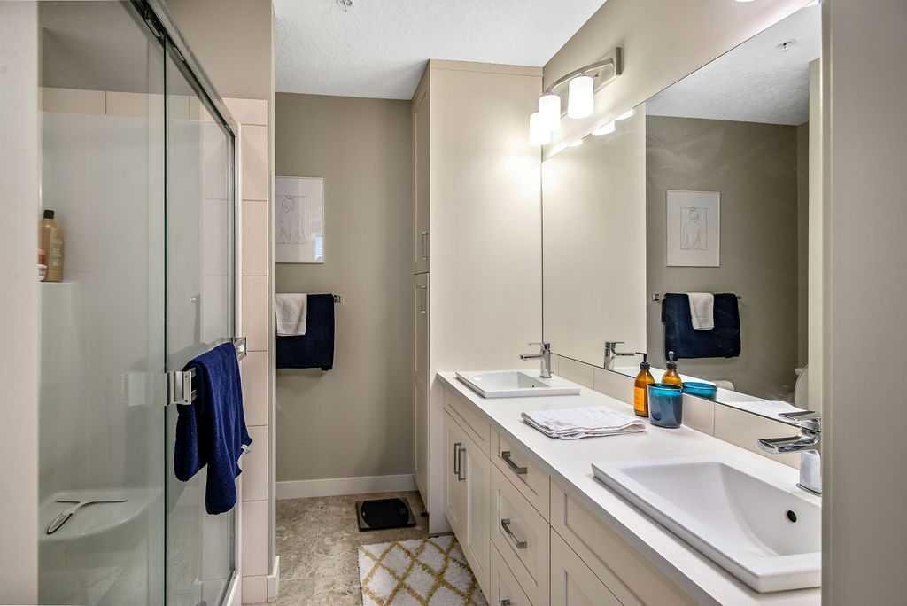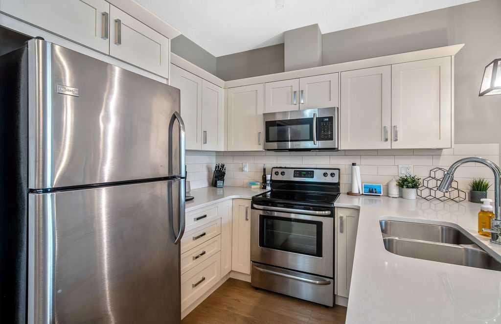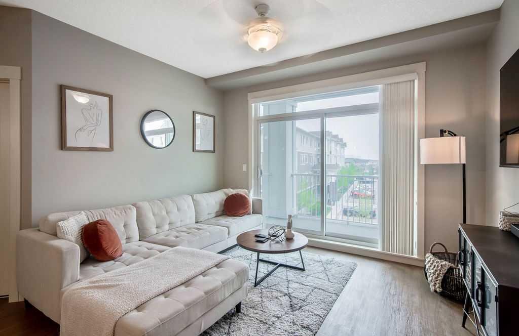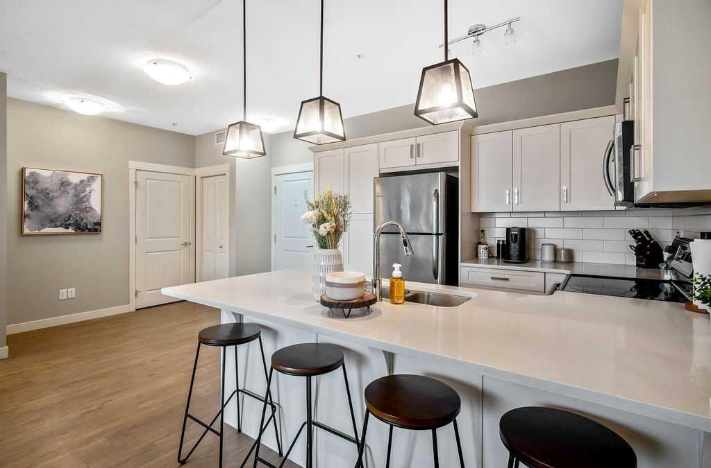 Light and airy, this lovely upper floor condo in beautiful Cranston showcases upscale finishes and a great location. Sunshine floods the main living area from the east through sliding glass doors and transom windows above. Vinyl plank flooring in a rustic wood aesthetic is a grounding base for the sleek palette of whites, greys, and black accents, giving the unit an effortless, high-end look. In the kitchen, plentiful cabinetry includes pantry cupboards, and quartz counters extend into an eating bar in a layout that connects the space so conversation flows without pause as you transition between cooking, dining, and relaxing. To one side, the primary bedroom is a self-contained retreat with a walk-through closet. A gorgeous ensuite offers dual sinks, a linen cupboard, and a glassed-in shower with a bench. The other wing of the flat holds the second bedroom and another full bathroom – a roommate scenario would work well here, as would a home office or nursery for a new family. In-suite laundry is a huge perk, and the covered balcony has BBQ hookups. This unit has underground titled parking as well. The Cranford Ridge complex is well-run, with attractive green spaces. The local shops at Cranston Corner are only steps away, as is access to the community pathway system, which extends into a large natural area. Parks and playgrounds are within walking distance, and there are several options for shopping and schools in a short drive. The Resident’s Association is close, and with your HOA membership you will have access to facilities and programs there, including the outdoor rink and racquet courts. Just across Deerfoot, Seton holds a plethora of shops, services, and restaurants, as well as the South Health Campus. This area is quickly becoming a new centre for the city, with a great range of amenities available nearby. Of course, if you like adventure, this community is well-located for you to be on the highway headed out of town. You could be first out into Kananaskis Country for camping, hiking, and alpine activities, or explore small town Alberta to find hidden gems, movie sets, and so much more. See this one today!