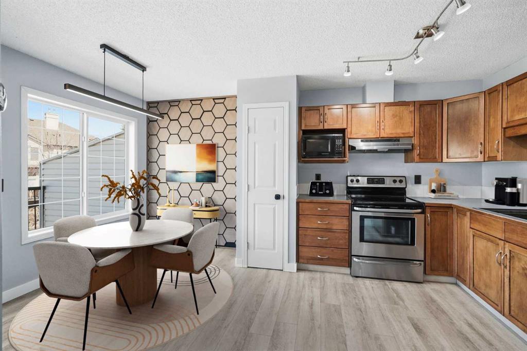 The kitchen features ample cabinetry, stainless steel appliances, and a layout that makes great use of the space, all while overlooking a dedicated dining area framed by a striking feature wall. A brand new refrigerator (January 2026) adds both style and peace of mind, complementing the already functional kitchen setup.