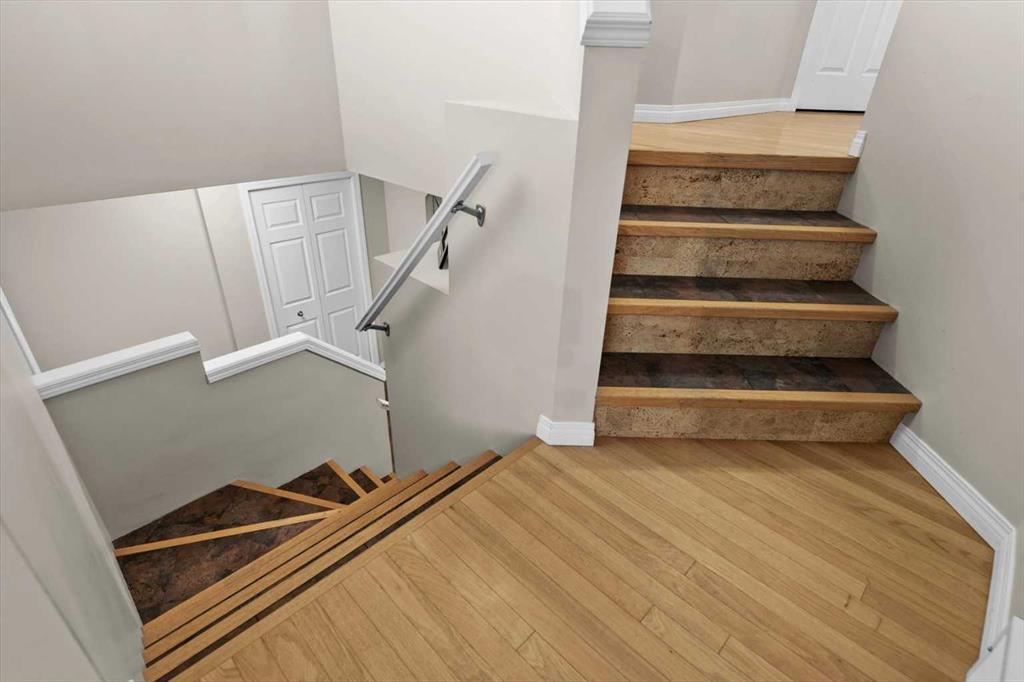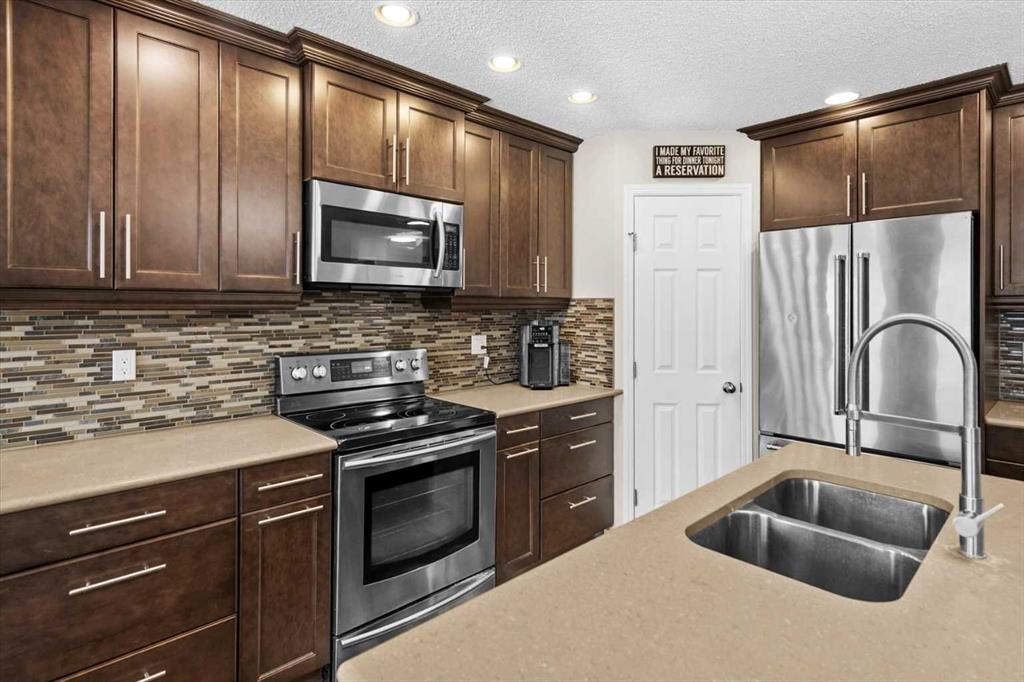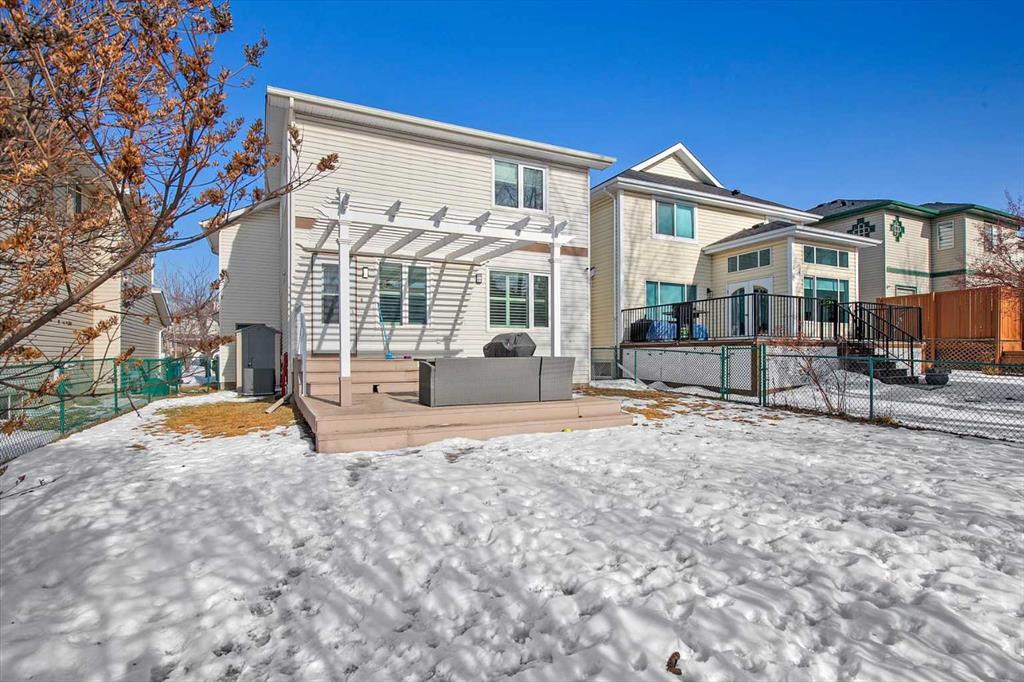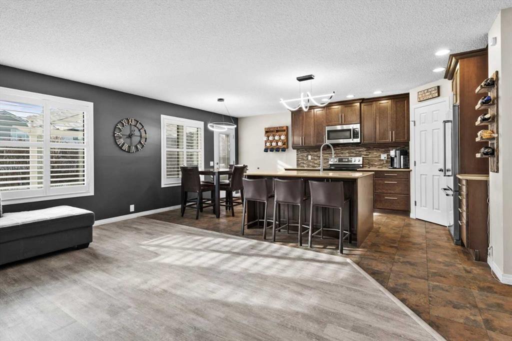 Beautiful two-storey home in Douglasdale offering 4 bedrooms (3 up, 1 down), 3 full bathrooms, and a double attached garage. The main level welcomes you with a spacious foyer leading into an open-concept kitchen featuring quartz countertops, premium appliances, and updated lighting. The kitchen overlooks the living room with new vinyl plank flooring (Feb 2026) creating a bright and functional space for everyday living and entertaining. Step outside from this level to a low-maintenance vinyl deck overlooking the fully fenced South facing yard with walking paths just outside the fence.