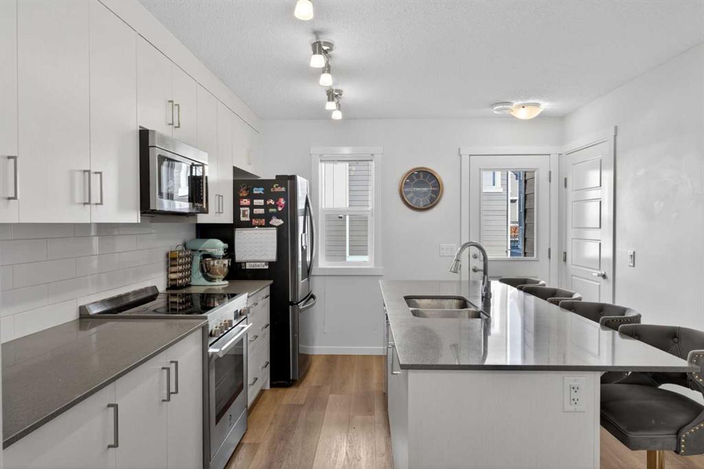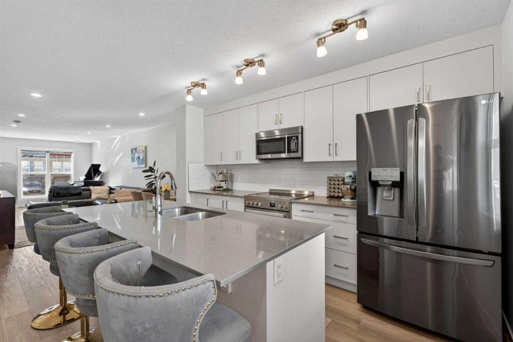 **Open House Sunday April 24th 12-3PM** Welcome to Riverstone in Cranston, where nature, lifestyle, and thoughtful design come together in one of Calgary’s most beautiful and sought-after communities. This stunning three-storey executive townhome offers 1,500+ sq. ft. of stylish living space & stands out with features that are truly hard to find in townhome living, including a separate fenced yard, low condo fees, and an exceptional third-level bonus room with rooftop deck. Located in the highly desirable lower portion of Cranston, just moments from the Bow River, scenic walking paths, parks, and playgrounds, this is a home that offers so much more than just great square footage, it offers a lifestyle. Riverstone is beloved for its peaceful setting, easy access to nature, and incredible outdoor amenities, making it a perfect fit for buyers who want both convenience and connection to the outdoors. Inside, the main floor is bright, open, and welcoming, designed for both everyday living and entertaining. The spacious living and dining areas flow seamlessly into the beautifully appointed kitchen, where a massive quartz island with breakfast bar becomes the natural gathering place for family and guests alike. Timeless white cabinetry, classic subway tile, stainless steel appliances, and direct access out to your own private backyard make this kitchen as functional as it is attractive—perfect for everything from daily routines to summer BBQs and easy indoor-outdoor living. Upstairs on the second level, you’ll find two generous bedrooms, including a spacious primary retreat that easily fits a king-sized suite and features its own private 3-piece ensuite. The second bedroom is equally well-sized and filled with natural morning light, while a full 4-piece bathroom located just outside the bedroom adds comfort and convenience for family members or guests. What truly sets this home apart, however, is the incredible third-floor bonus room—a rare and versatile space seldom found in townhomes. Whether you envision a home office, media room, fitness area, guest retreat, playroom, or creative studio, this upper-level flex space offers endless possibilities. Even better, it opens onto your private rooftop deck, creating the perfect spot to enjoy morning coffee, unwind in the evening, or soak in the fresh air above it all. This combination of bonus room plus rooftop outdoor space is an absolute standout. Another rare feature is the separate fenced yard—ideal for a dog owner, young family, or anyone who appreciates having a private outdoor area for BBQs, relaxing in the sun, or enjoying a bit of extra space that many townhomes simply do not offer. With sunny west exposure, this yard is a true extension of the home. Also included is a designated parking stall conveniently located just steps from the front door. You’ll also enjoy access to Century Hall and all of Cranston’s exceptional amenities, including skating, hockey, tennis courts, a splash park, skate park, gymnasium, and more.