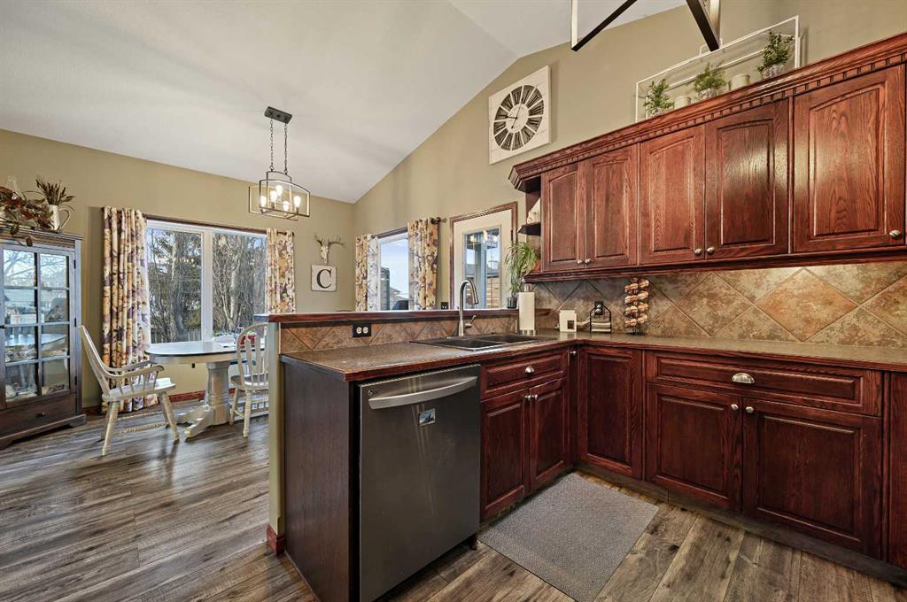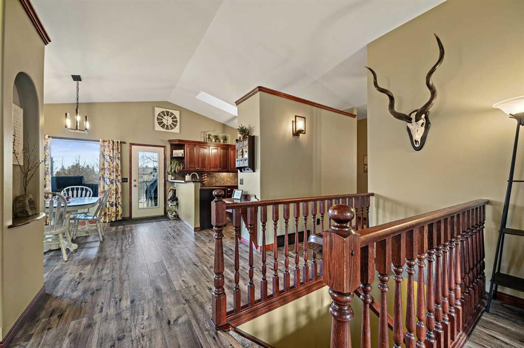 The inviting layout features high vaulted ceilings, natural woodwork, abundant storage, and a fully finished basement designed for everyday living and entertaining. The kitchen offers a pantry, ample cabinetry, and seamless flow into the dining area and main living room, making it ideal for family gatherings and hosting guests. This home includes five bedrooms and three full bathrooms across two levels, along with two fireplaces. A cozy wood-burning fireplace warms the main floor, while the lower level showcases a gas fireplace with stone and wood detailing, perfect for movie nights or relaxing evenings. Designed for modern comfort, the home features central air conditioning, a jetted tub, and a forced-air natural gas furnace (2021). Recent upgrades provide peace of mind, including a new asphalt shingle roof (2025), new Hardie Board siding (2025), hot water tank (2020), and an insulated double attached garage complete with mezzanine, water, and 220-volt power. The exterior truly shines with a large private backyard and expansive deck with custom-built privacy screening. Additional outdoor features include underground sprinklers, garden space, a fire pit, dog run, and hot tub (as-is), creating the perfect setting for relaxation or entertaining. Located in a family-friendly community with nearby schools, playgrounds, sidewalks, and street lighting, this home offers both lifestyle and convenience. A rare opportunity to enjoy indoor comfort and outdoor living in one exceptional package