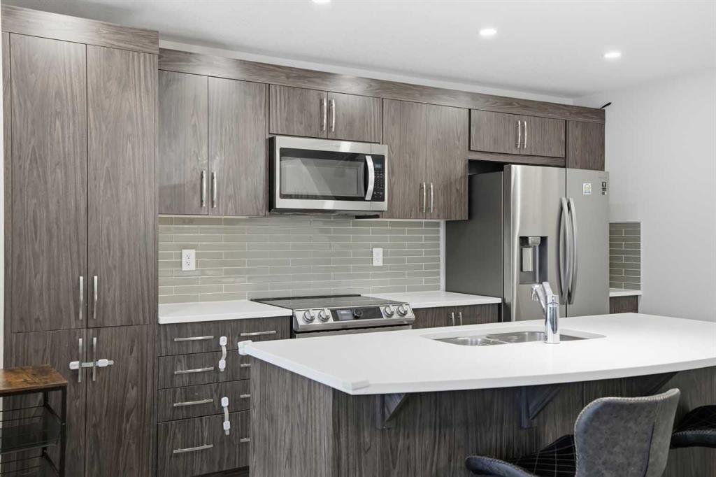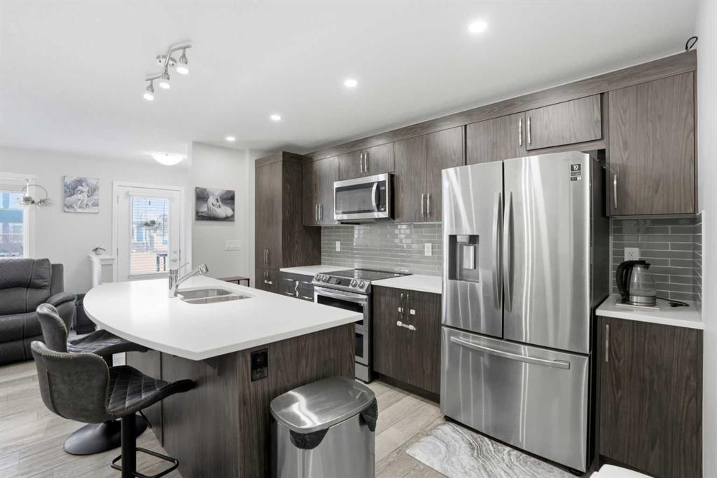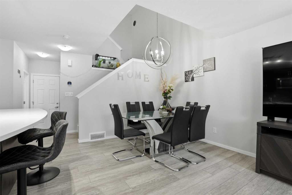 The open-concept main floor was built to host. A bright kitchen with white quartz countertops, stainless steel appliances, sleek track lighting, and a statement island that says, “pull up a chair and stay awhile.” The dining area is elevated with a modern chandelier, and luxury vinyl plank flooring runs throughout, durable, stylish, and ready for whatever life throws at it.