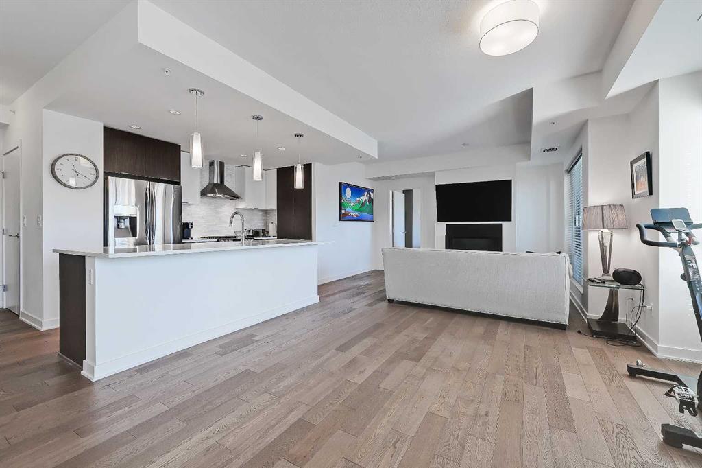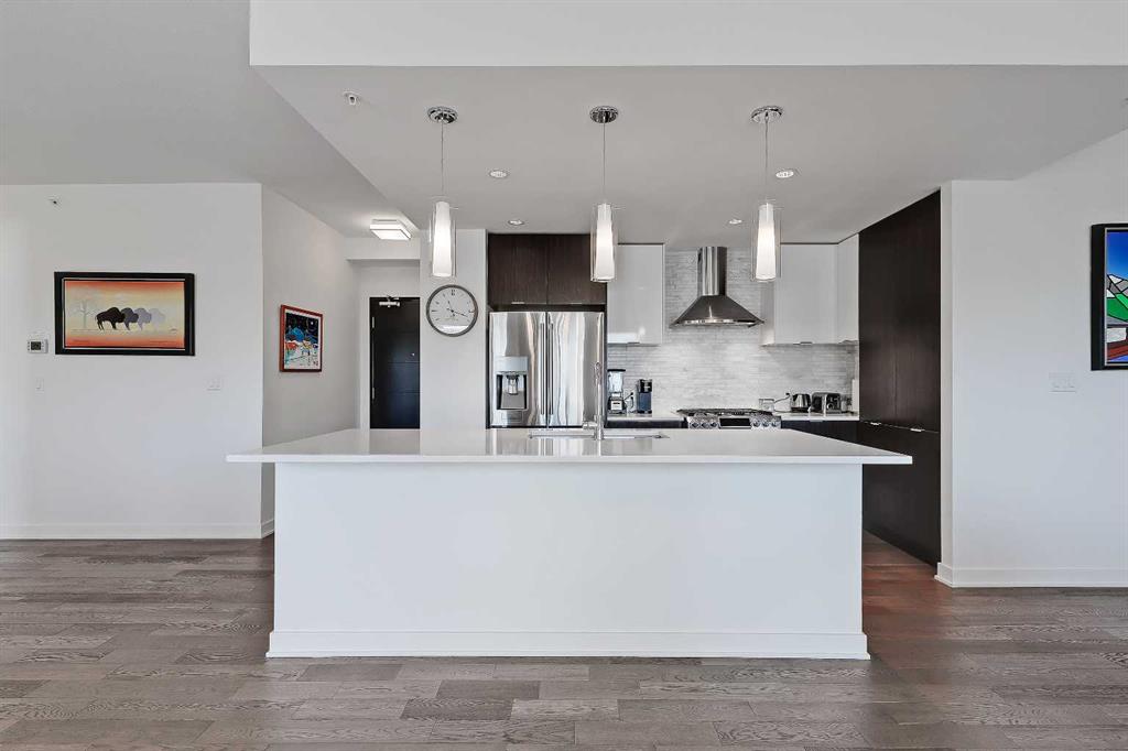 **OPEN HOUSE THIS WEEKEND: SUNDAY, JANUARY 18 AT 2 PM – 4 PM** *VISIT MULTIMEDIA LINK FOR FULL DETAILS & FLOORPLANS!* Welcome to SUB-PENTHOUSE LIVING at Vogue! This 2-bed + den, 2-bath condo w/ over 1,200 sq ft on the 34th-floor w/ amazing city skyline band river views boasts two balconies opening off the main living areas. Naturally bright living w/ soaring ceilings, modern light and ceiling details, an open concept floorplan, & engineered hardwood flooring throughout (no carpet!), you are going to love the urban life at Vogue. Gather around the massive island w/ breakfast bar seating & dual undermount sink in the modern, sleek kitchen. Stainless steel appliances include a fridge w/ French doors, a deli drawer, & a freezer drawer, a gas stove & hood fan, a dishwasher, & built-in microwave. White quartz counters & marbled tile backsplash complement the wood & white cabinetry & modern pendant lighting. The open-concept living, dining, and den area has large windows, a gas fireplace, & access to TWO balconies via sliding glass doors. 2 bedrooms flank the main living space for ultimate privacy. The primary bedroom features a walk-in closet w/ custom built-in storage, and a private 5-pc ensuite. Featuring white quartz counters, modern faucets, dual undermount sinks, wood grain cabinetry, a standup shower, & soaker tub w/ full height tile, you’ll find everything you want & more in a primary suite. The secondary bedroom on the opposite side of the unit features a large window, a walk-in closet w/ custom built-in storage, & quick access to the main 4-pc bathroom w/ white a quartz counter, undermount sink, modern faucet, wood grain cabinets & a tub/shower combo w/ full-height tile. Rare for condo living, this unit has a laundry room w/ a washer & dryer, & heated, underground parking w/ a storage locker. VOGUE is a high-end building w/ lots of amenities, including an elegant lobby, full-time concierge, gym, billiards, large party room w/ kitchen & multiple rooftop terraces. Surrounded by parks, transit, the LRT, shopping & more, & within walking distance to the downtown core & all Kensington shops & services – this location truly cannot be beaten.