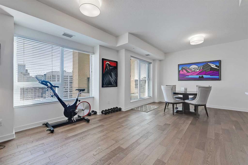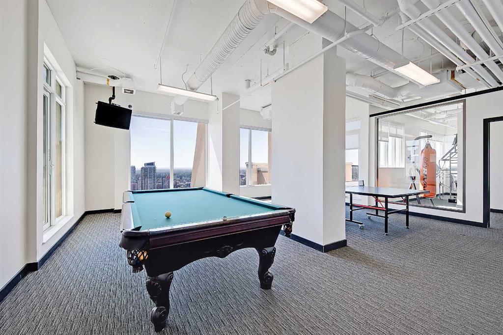 *VISIT MULTIMEDIA LINK FOR FULL DETAILS & FLOORPLANS!* Welcome to SUB-PENTHOUSE LIVING at Vogue! This 2-bed + den, 2-bath condo w/ over 1,200 sq ft on the 34th-floor w/ amazing city skyline band river views boasts two balconies opening off the main living areas. Naturally bright living w/ soaring ceilings, modern light and ceiling details, an open concept floorplan, & engineered hardwood flooring throughout (no carpet!), you are going to love the urban life at Vogue. Gather around the massive island w/ breakfast bar seating & dual undermount sink in the modern, sleek kitchen. Stainless steel appliances include a fridge w/ French doors, a deli drawer, & a freezer drawer, a gas stove & hood fan, a dishwasher, & built-in microwave. White quartz counters & marbled tile backsplash complement the wood & white cabinetry & modern pendant lighting. The open-concept living, dining, and den area has large windows, a gas fireplace, & access to TWO balconies via sliding glass doors. 2 bedrooms flank the main living space for ultimate privacy. The primary bedroom features a walk-in closet w/ custom built-in storage, and a private 5-pc ensuite. Featuring white quartz counters, modern faucets, dual undermount sinks, wood grain cabinetry, a standup shower, & soaker tub w/ full height tile, you’ll find everything you want & more in a primary suite. The secondary bedroom on the opposite side of the unit features a large window, a walk-in closet w/ custom built-in storage, & quick access to the main 4-pc bathroom w/ white a quartz counter, undermount sink, modern faucet, wood grain cabinets & a tub/shower combo w/ full-height tile. Rare for condo living, this unit has a laundry room w/ a washer & dryer, & heated, underground parking w/ a storage locker. VOGUE is a high-end building w/ lots of amenities, including an elegant lobby, full-time concierge, gym, billiards, large party room w/ kitchen & multiple rooftop terraces. Surrounded by parks, transit, the LRT, shopping & more, & within walking distance to the downtown core & all Kensington shops & services – this location truly cannot be beaten.