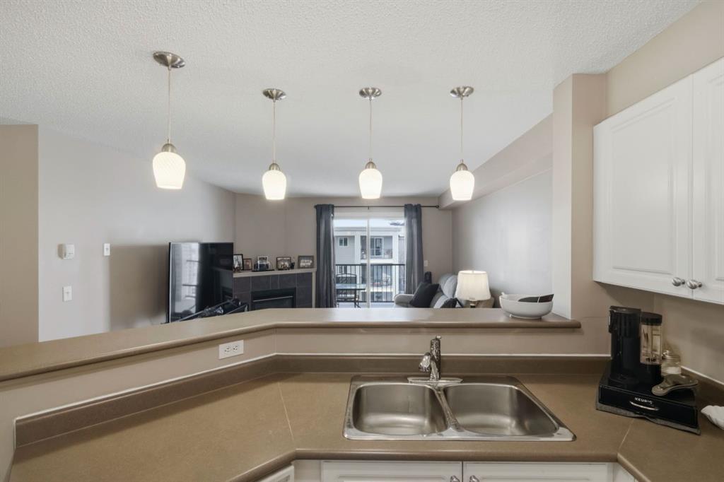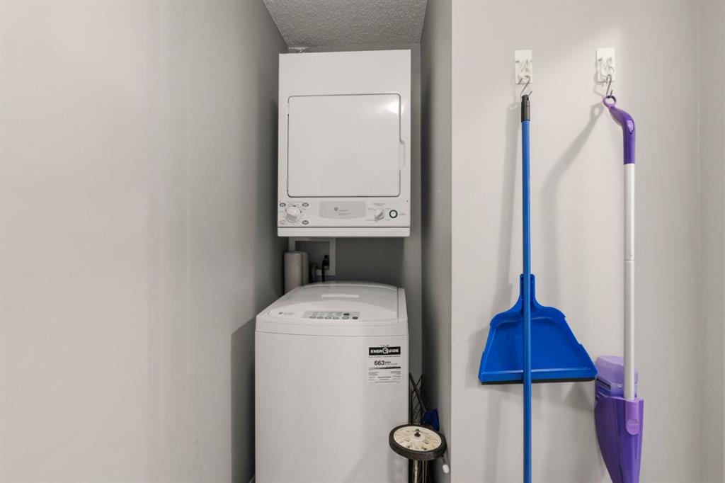 Top floor living with TWO parking stalls! This well-maintained 2-bedroom, 2-bathroom top floor unit offers comfort, privacy, and exceptional convenience. The bright, functional kitchen features plenty of cabinetry and a convenient eating bar, perfect for casual dining or entertaining. The cozy gas fireplace adds warmth and character to the living area, while large windows bring in natural light. Step outside to the sunny private balcony complete with a natural gas hookup, ideal for summer BBQs and outdoor relaxation. The unit also includes a spacious laundry and storage room with stacking washer and dryer, adding to the practical layout. A rare bonus: TWO PARKING STALLS, one titled underground and one surface stall, offering flexibility for owners and guests. Enjoy low maintenance living with condo fees that include all utilities, and a location just steps from shops, restaurants, and everyday amenities.
