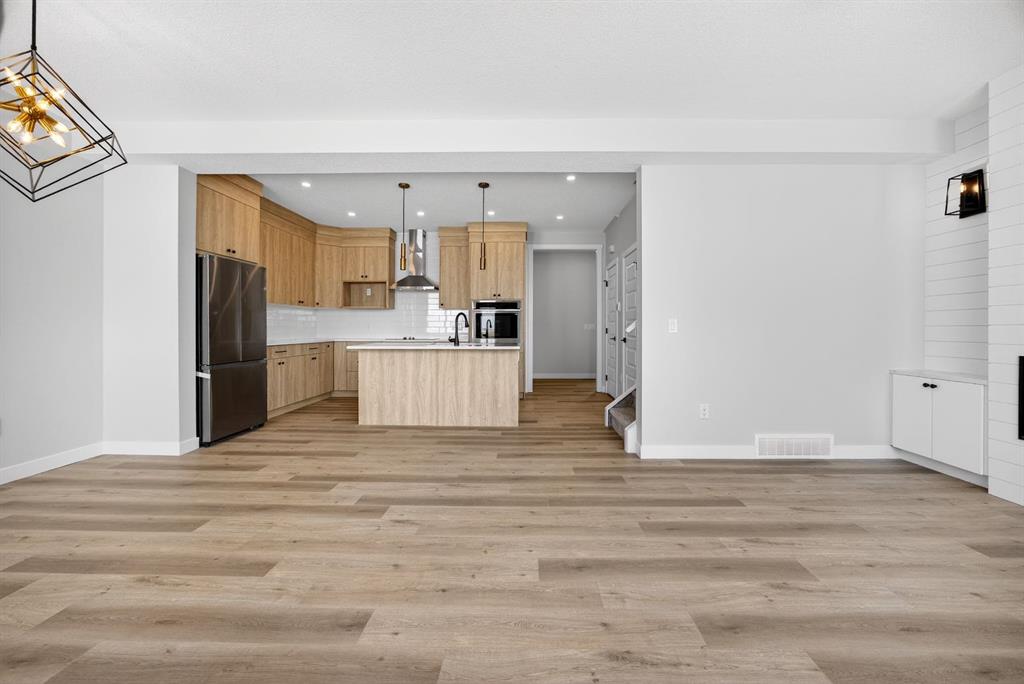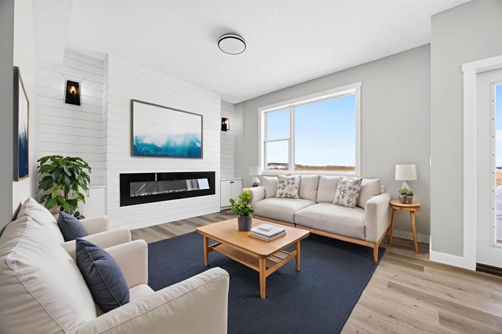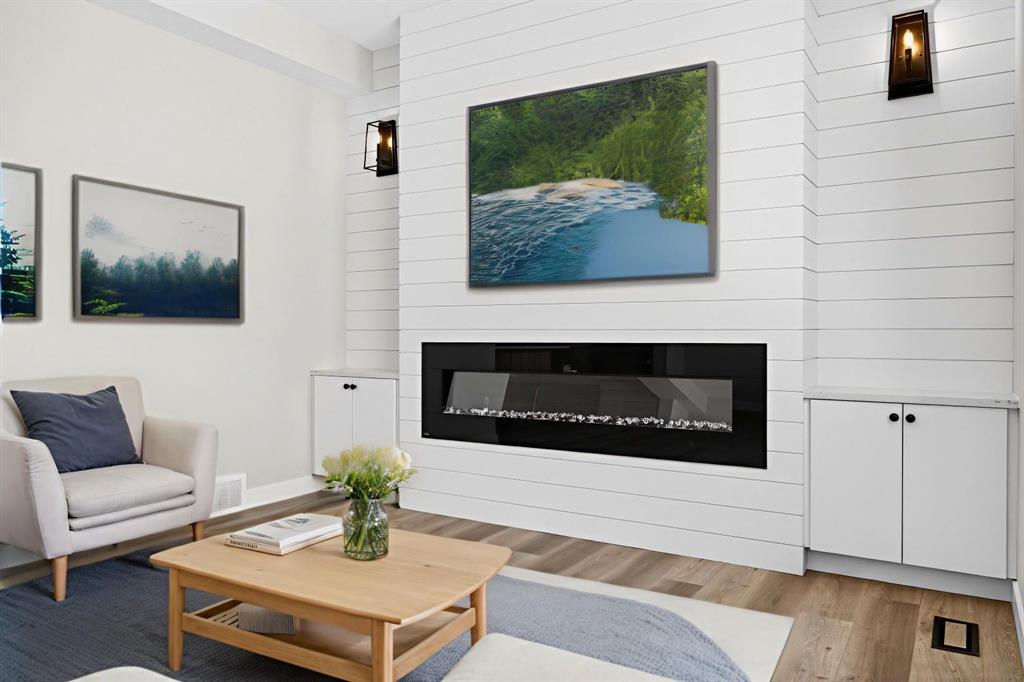 The living room is a standout feature, highlighted by a large built-in electric fireplace complete with Bluetooth speakers and a wireless remote — ideal for cozy evenings or entertaining. A stunning white shiplap accent wall adds character and texture to the space.