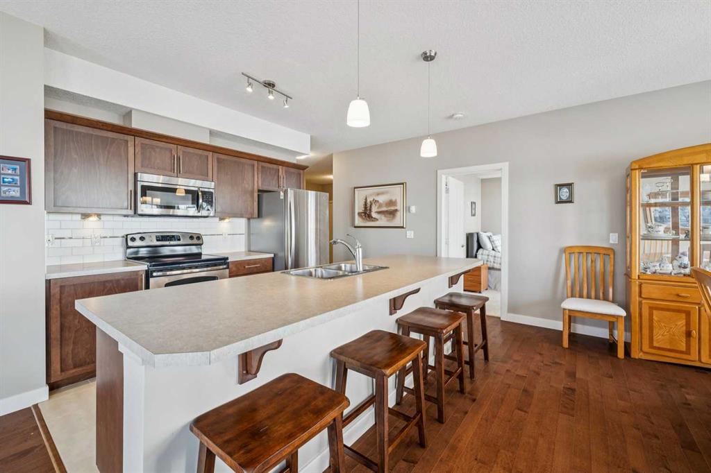 Welcome to this meticulously maintained third-floor end unit offering 962 sq ft of bright and functional living space with 2 bedrooms, 2 full bathrooms and title parking in a well-managed complex. Facing into the quiet centre clubhouse and courtyard area, this home provides a peaceful setting with minimal noise—perfect for comfortable everyday living. Pride of ownership is evident throughout, with the unit showing exceptionally well and having been thoughtfully cared for by the current owner. The open-concept layout is both practical and inviting, seamlessly connecting the kitchen, dining, and living areas—ideal for entertaining or relaxing at home. The spacious kitchen is a true focal point, featuring a large centre island, ample cabinetry, and newer appliances, including a recently upgraded SS refrigerator and stacked washer and dryer near the tiled foyer. Expansive windows throughout the unit allow for an abundance of natural light, enhancing the bright and airy atmosphere with beautiful maple engineered hardwood floors. The primary bedroom offers a private retreat with incredibly high ceilings, a walk-in closet and a 3-piece ensuite. The second bedroom is generously sized and conveniently located near the 4-piece bathroom, making it perfect for guests, a home office, or shared living. Additional highlights include two built-in wall air conditioning units for year-round comfort, a large private balcony overlooking the beautifully maintained clubhouse and courtyard area with a new Phantom Retractable Screen, a titled underground parking stall, separate titled storage locker, and bike storage. This well-managed complex offers excellent amenities within the clubhouse, including a fitness centre with new equipment, resident lounge with pool table, darts, TV, a full kitchen, extra seating, washrooms, and ample visitor parking. Ideally located with easy access to major roadways, shopping, YMCA, restaurants, and all essential services. A quiet, exceptionally well-kept massive end unit in a desirable location—this is one you won’t want to miss.