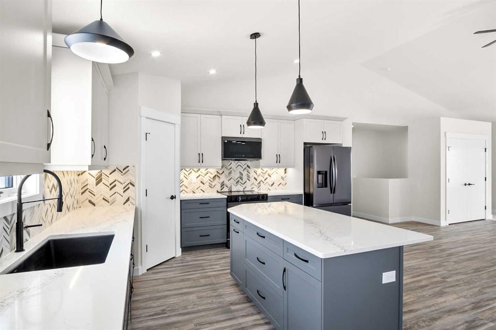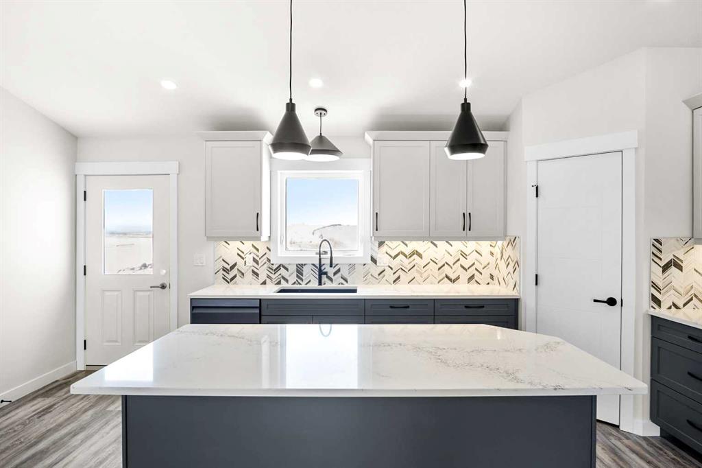 This beautifully built home offers modern finishes, functional design, and quality craftsmanship throughout. The main level features a bright open-concept living and dining area that flows seamlessly into the stylish kitchen, complete with stainless steel appliances, quartz countertops, an oversized island, and abundant cupboard space. A large pantry with wood shelving provides excellent storage. The main floor includes three bedrooms, including a spacious primary bedroom with a large walk-in closet and a private 3-piece ensuite. Two additional generously sized bedrooms and a 4-piece main bathroom complete the level, along with several convenient storage closets. The double attached garage is equipped with in-floor heat and 220 power, making it ideal for parking, projects, or extra workspace. Downstairs, the unfinished basement offers incredible potential for future development, featuring 9-foot ceilings, in-floor heat, and laundry hookups, ready for your custom design. The front yard will be completed with sod and one tree when weather permits, adding the finishing touch to this beautiful new home. A fantastic opportunity to own a brand-new bungalow in a welcoming neighborhood—perfect for families, or anyone looking for modern comfort and future potential.