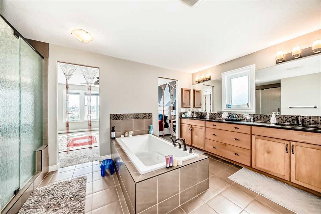 Three additional bright bedrooms—each with its own walk-in closet—share a well-appointed 5-piece bathroom with dual vanities and a wall-mounted mirror. The upper-level laundry room and large linen closet add everyday convenience.