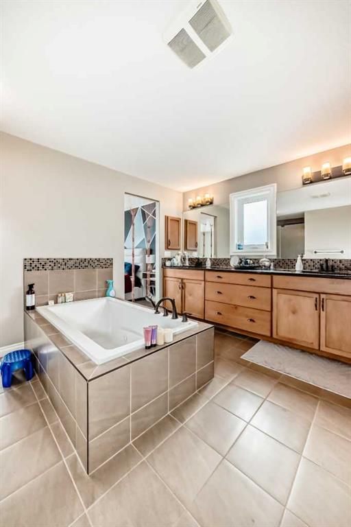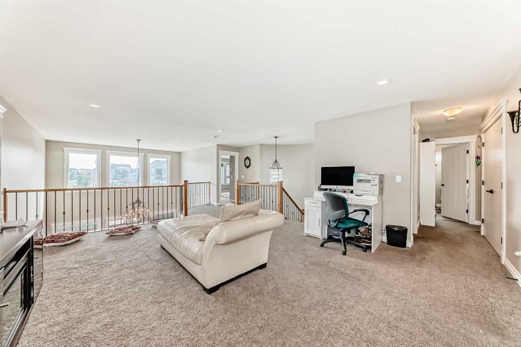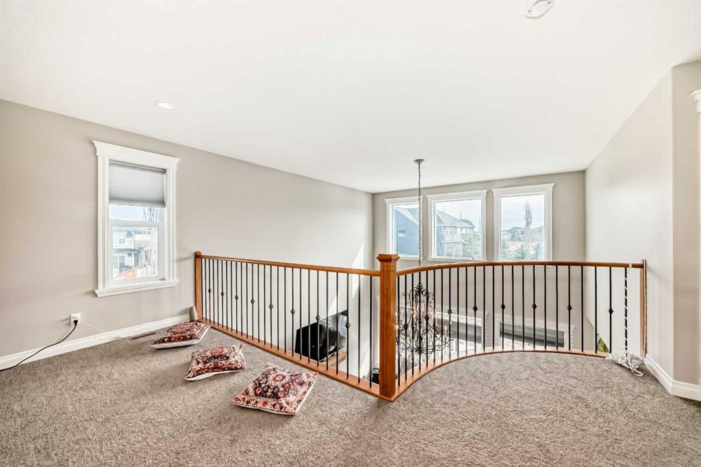 Up the stunning semi-spiral staircase, a generous bonus room overlooks the main living space below, offering the perfect retreat for relaxation or entertainment. The thoughtfully designed split floor plan ensures privacy in the primary suite, which overlooks the rear pathway and includes a walk-in closet and a luxurious 5-piece ensuite complete with a jetted tub, standalone shower, dual vanity, and private water closet.