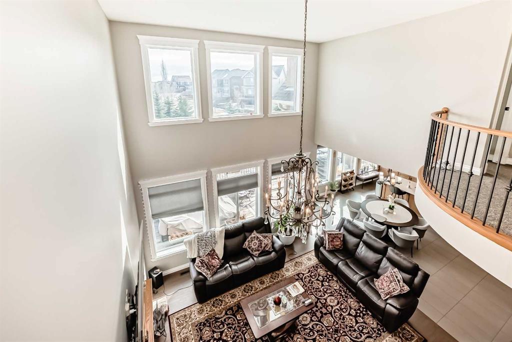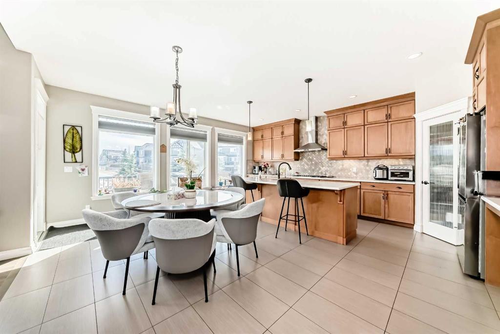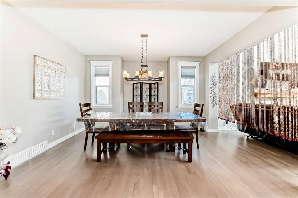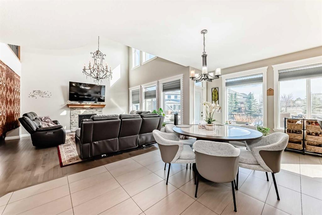 The main floor is having Bedroom with an attached Bathroom and is full of natural light from expansive south-facing windows. The open-concept main floor seamlessly connects the dining room, living room, and kitchen—perfect for entertaining or keeping an eye on the family. The spacious dining area comfortably seats eight people and flows into the impressive two-story living room, highlighted by a statement chandelier and cozy gas fireplace.