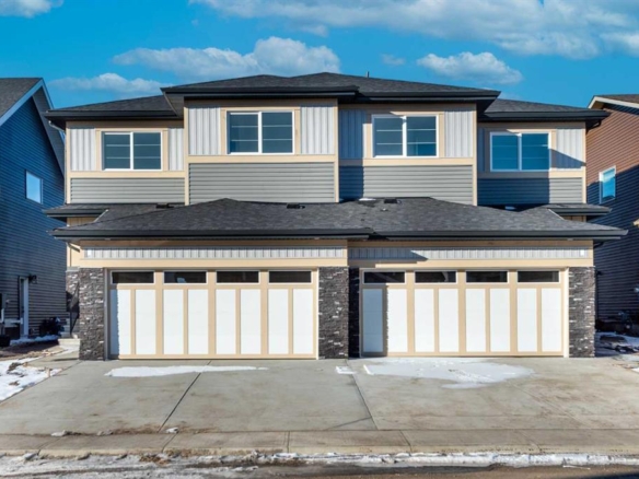 Discover the Eton, a move-in ready home in Chestermere with 1,490 sq ft of stylish living space. This craftsman-style home features Hardie board siding, black-framed windows, and an open-concept layout with luxury vinyl plank flooring. The rear-facing kitchen connects seamlessly to the backyard and includes Winter-stained maple cabinetry, quartz countertops, Samsung stainless steel appliances, a chimney hood fan, a large island, and a picture window above the granite sink. A functional back entry and walk-in pantry add convenience, while the front-facing great room is bright and inviting. Upstairs, the rear primary bedroom includes a dual-sink ensuite, complemented by upper-floor laundry and two additional bedrooms. Situated in Clearwater Park, one of Chestermere’s newest master-planned communities, residents enjoy exclusive access to the Clearwater Community Clubhouse. Cardel Homes offers better design and quality, making this a standout opportunity for modern living. Photos are representative.