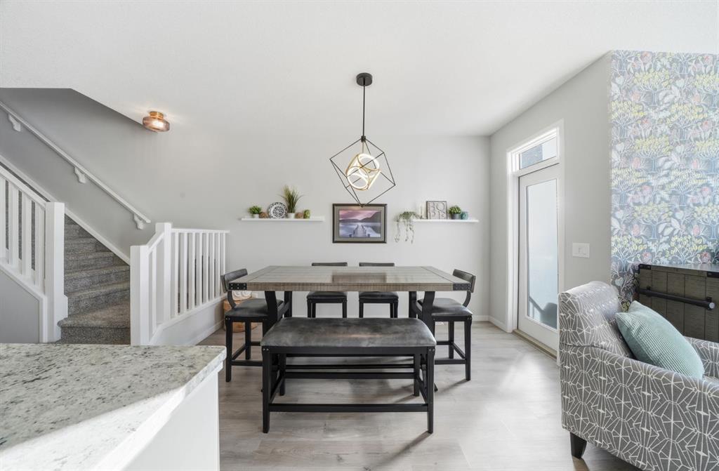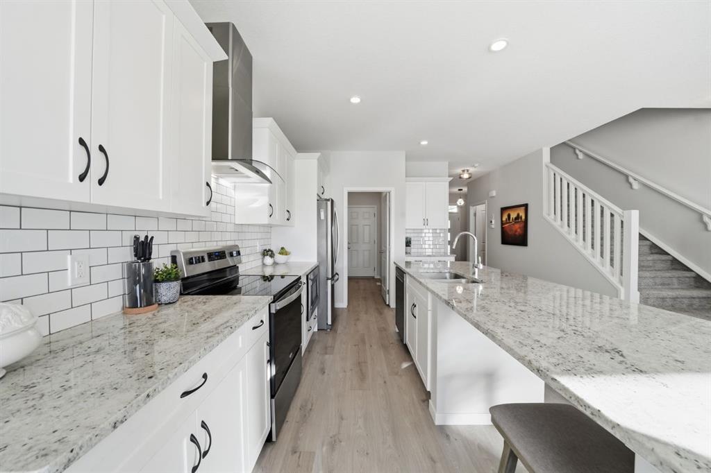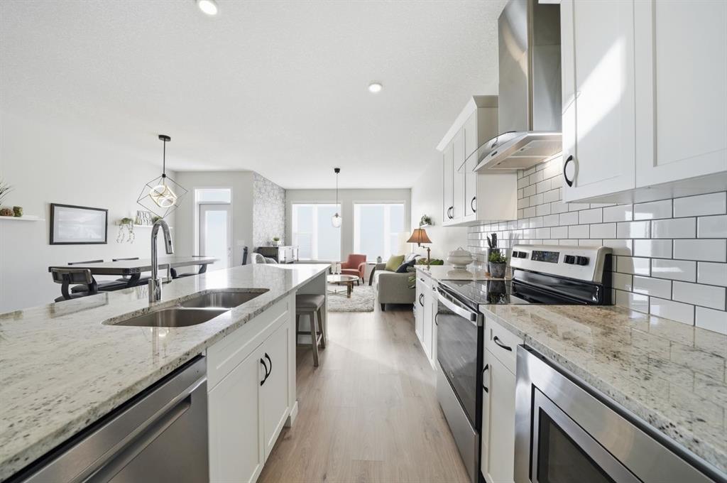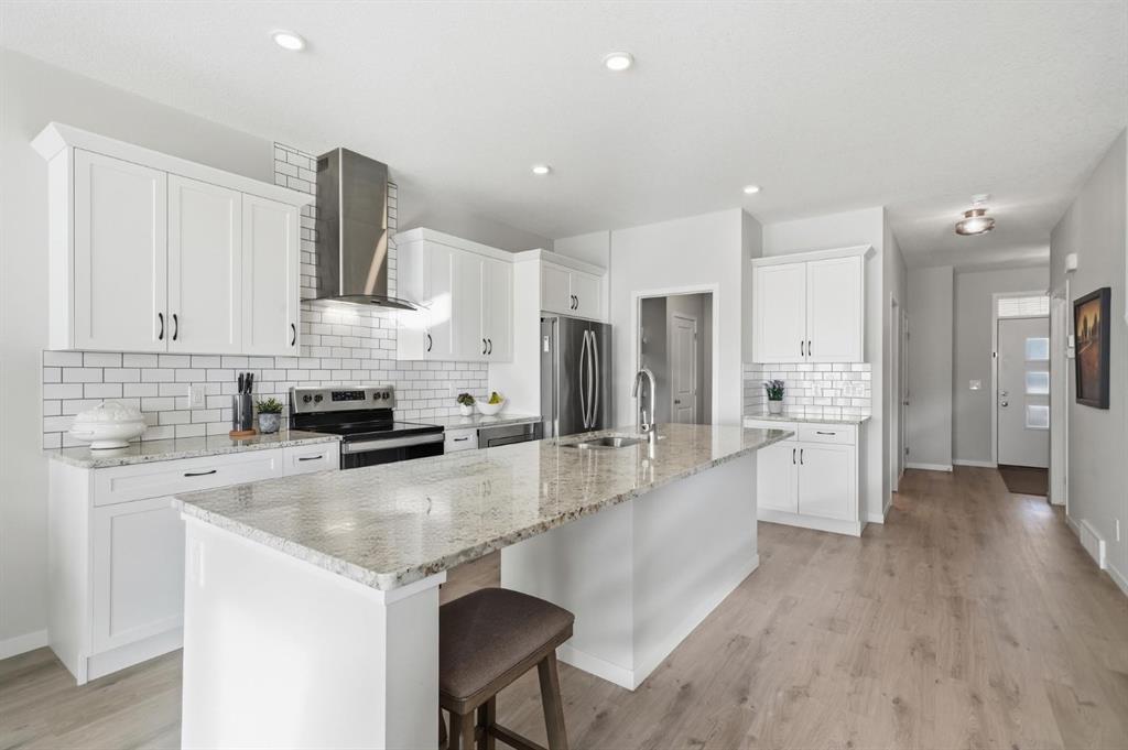 The exterior showcases Hardie board siding and stonework, delivering strong curb appeal with lasting quality. Inside, laminate flooring extends through the main level and basement, complemented by upgraded lighting and window coverings throughout. The open concept main floor is anchored by a clean, modern white kitchen featuring granite countertops, subway tile backsplash, stainless steel appliances, range hood fan, a large island with seating, and extensive cabinetry along with a walk through pantry that enhances both storage and everyday convenience. The dining area opens onto an upgraded 12×12 patio, with a covered space below off the walkout level for additional outdoor living.