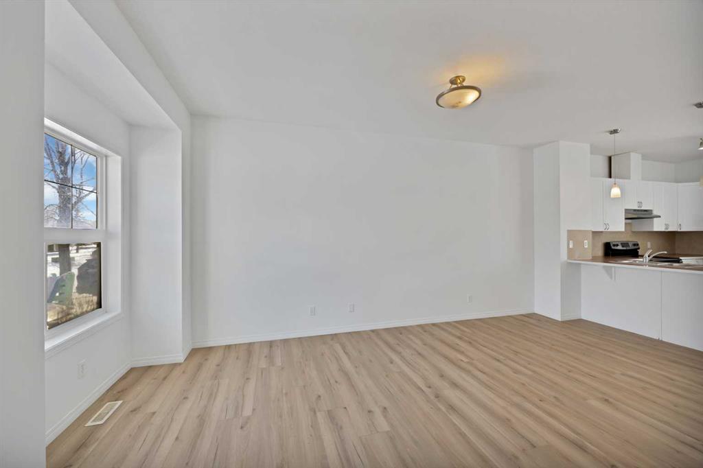 The main floor features a **bright and functional open-concept layout** with large windows that allow natural light to fill the living space. The kitchen offers ample cabinetry, practical counter space, and a breakfast bar that flows into the dining area, creating a comfortable space for both everyday living and entertaining. The dining area connects seamlessly with the living room, making the main floor ideal for gathering with family and friends.