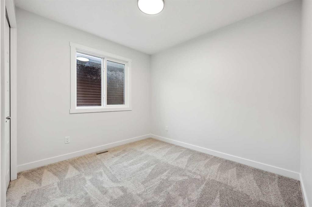Upstairs, the primary bedroom includes a walk-in closet and ensuite. Two additional bedrooms, a full bathroom, and upper-level laundry complete this floor. Interior finishes include maple-stained railing with nickel spindles, Cozy White luxury vinyl plank, Off Shore carpet, and Micabella LVT. This home includes a side entry with basement rough-ins, a 9’ foundation, and gas lines to the range and BBQ. A gravel parking pad is also included.