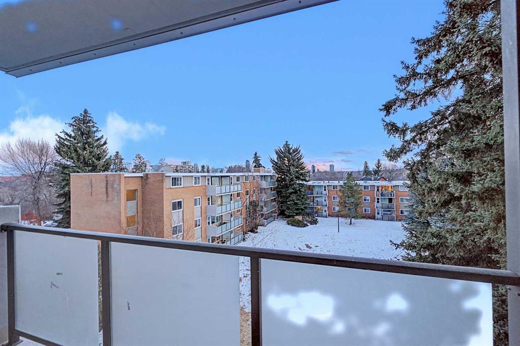 The south-facing balcony offers a direct view over the quiet, landscaped courtyard and the downtown skyline. The complex is exceptionally well-maintained, having completed several building-wide efficiency and aesthetic upgrades: new unit and elevator doors (2025), hallway painting (2025), balcony doors (2019), and four new hot water tanks (2018). These complement earlier updates to windows and balcony railings & glass.