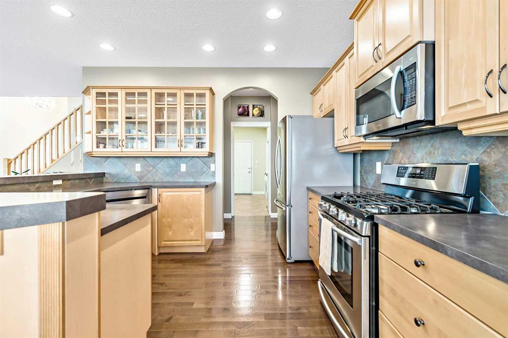 Welcome to this beautifully maintained two-storey home offering the perfect blend of space, comfort, and functionality in a highly desirable location. A dramatic vaulted ceiling entrance and gleaming hardwood floors create an impressive first impression the moment you step inside. The bright and inviting main floor features a spacious living room with a large window and cozy gas-burning fireplace, filling the home with natural light and warmth. The open-concept kitchen is designed for both everyday living and entertaining, complete with stainless steel appliances, gas stove, central island, and a convenient walk-through pantry leading directly to the mudroom/laundry area. The generous dining room, surrounded by additional windows, provides plenty of space for family meals and gatherings while allowing sunlight to pour throughout the home. Upstairs you’ll find a versatile loft with custom built-ins, ideal for a home office, study area, or reading nook. The upper level also features three generously sized bedrooms, including a spacious primary suite with a walk-in closet and a luxurious 5-piece spa-inspired ensuite designed for relaxation. The fully finished basement expands the living space with a huge family room, bar area, fitness room, storage room, and rough-in plumbing for a future bathroom, offering excellent flexibility for growing families. Step outside to enjoy the fully landscaped backyard featuring a mature tree, oversized deck with gas BBQ line, and storage shed, perfect for entertaining or relaxing outdoors. Note: Central air conditioning and a double oversized attached garage with loft storage provide added comfort and convenience. Ideally located within walking distance to schools, playgrounds, shopping, public transit, and Fish Creek Park. This home shows extremely well with pride of ownership!