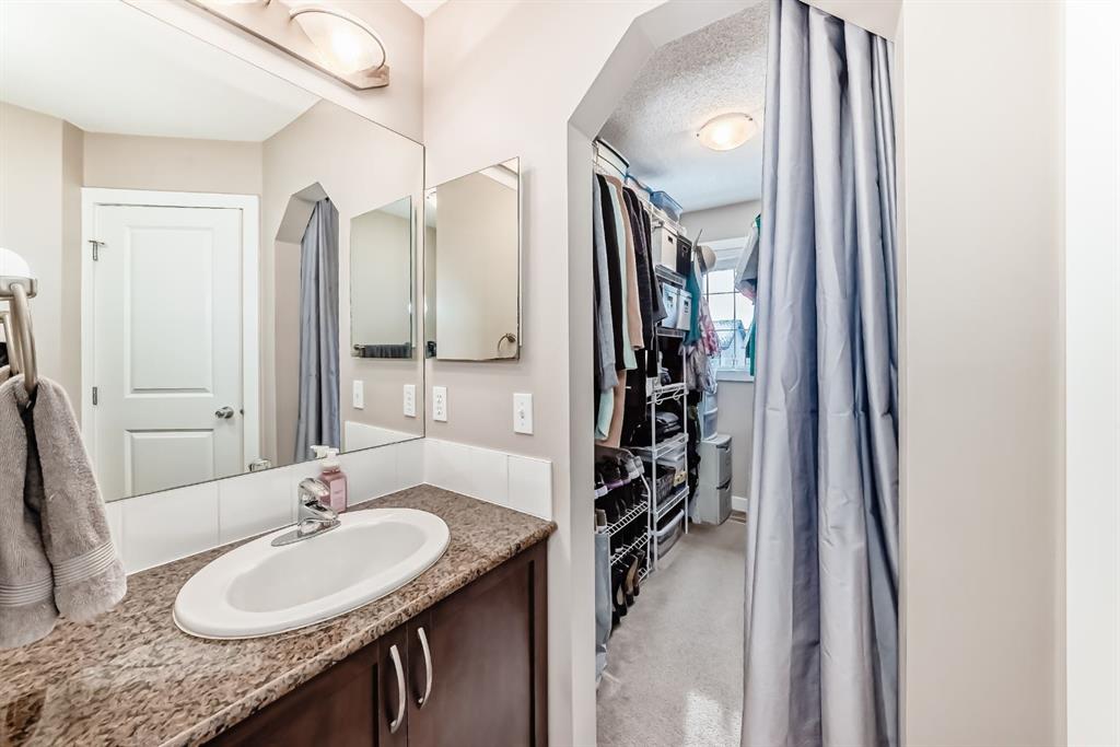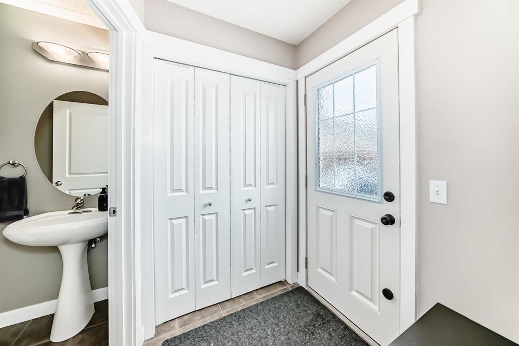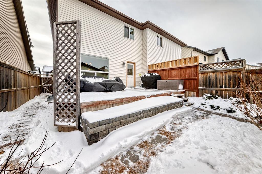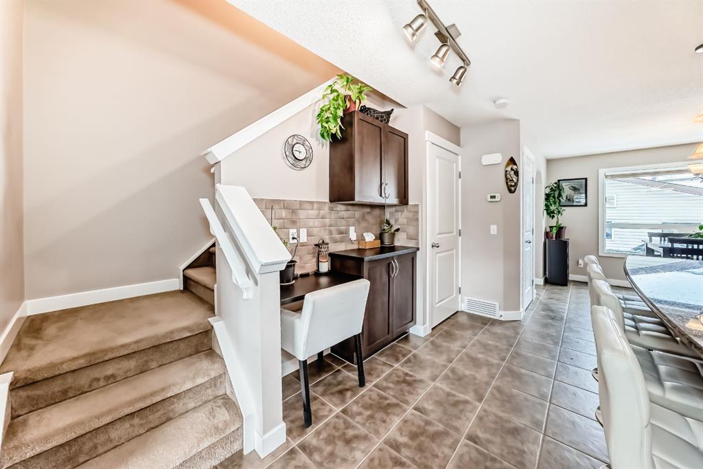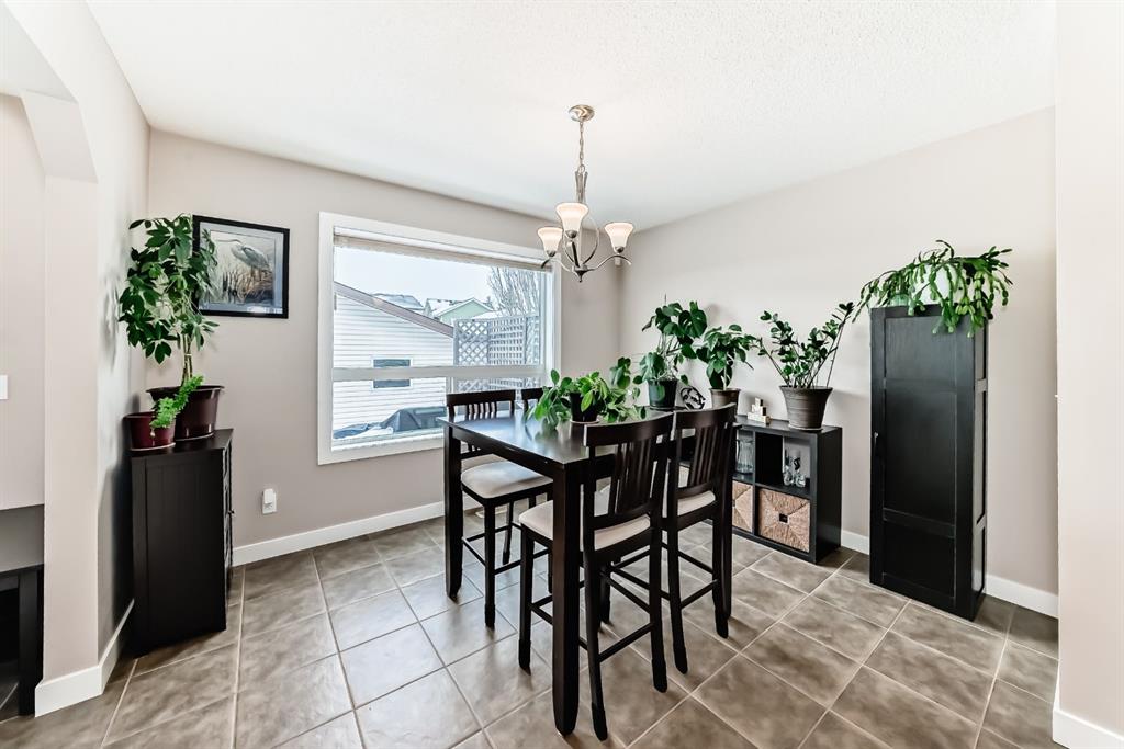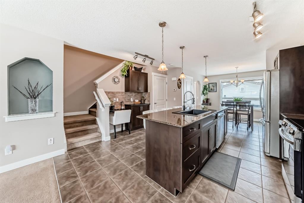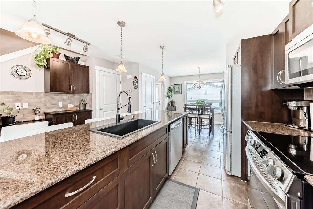 Beautiful curb appeal as you walk up to this attached home with full front covered veranda and character accents in Panorama Hills. Walk into this well-appointed open concept main floor with ceramic tiled flooring and warm carpet in the living room. The kitchen boasts dark, rich Maple shaker cabinetry with single level island and granite countertops. Stainless steel appliances (new stove 2023) and upgraded fixtures including a newer Siligranit deep sink (2024) and pendulum lights. Dining area overlooks private back yard. Built in computer/task desk with extra cabinets and matching modern subway backsplash. Main floor was meant for entertaining with great flow and art niche. Upper level includes three bedrooms, all with walk in closets. The primary suite includes a three-piece ensuite that has an oversized walk-in shower. Newer stacked washer and dryer (2025) finish the upper level. The back mud room with brand new door leads to private back yard with deck with gas and lower yard. Double detached garage backing onto alley is bright with south facing windows. Unspoiled basement with newer high efficiency two state furnace (2020) with egress windows awaits your final finishes. Many new upgrades including new roof (2025) new garage door (2025) and new back door (2026). Located just a few steps from park and playground and close to amenities and schools with easy access to Stoney Trail. Your new home awaits your arrival!