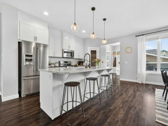 This beautifully updated two-storey with a fully developed basement offers over 3,000 sq ft of living space and an exceptional lifestyle. Perfectly situated on a spacious pie-shaped lot backing onto an alley, the property stands out with refreshed landscaping, raised garden beds framed in black iron, flourishing perennials, and a treated wood two-tier deck overlooking the yard. Patio doors open to the deck and are equipped with a retractable screen, allowing fresh air to flow through the home during warmer months. With plenty of space for summer BBQs, gardening, or even the potential for RV parking, the backyard is built for entertaining and family fun. Step inside and you are welcomed by a bright and inviting layout with 9-foot ceilings, hardwood, luxury vinyl plank, tile flooring, upgraded lighting, and thoughtful finishes throughout. The show-stopping great room boasts 18-foot ceilings, large windows that flood the space with natural light, and a dramatic gas fireplace surrounded by a wall of floor-to-ceiling stone. The chef’s kitchen offers sleek cabinetry, stainless steel appliances, a large central island, modern fixtures, and a walkthrough pantry conveniently connected to the mudroom and laundry. The open flow into the dining area makes this level ideal for both casual family meals and formal entertaining. A private office/den with French doors provides the perfect spot for working from home, and a stylish two-piece bath completes the main floor. Upstairs, you’ll find three spacious bedrooms including a primary suite with mountain views, a large walk-in closet, and a spa-inspired 5-piece ensuite with dual sinks, a soaker tub, and a separate shower. A bonus room with vaulted ceilings offers the perfect gathering place for family movie nights, a playroom, or simply a quiet retreat. A full 4-piece bathroom completes the upper level. The fully developed basement extends your living space with endless possibilities, featuring a spacious fourth bedroom and a 4-piece bathroom with tub/shower combination, making it ideal for guests, teens, or extended family. The remainder of the basement offers flexible space for a home gym, recreation area, or media room, along with generous storage. Additional highlights include LVP flooring on all three levels, gas stove hookup, custom blinds, a heated garage, upgraded interior and exterior lighting, a 75-gallon hot water tank, and a beautifully maintained exterior with a stained fence and deck. This move-in ready home combines style, comfort, and practicality in a highly sought-after community, an ideal fit for families looking to enjoy both space and modern upgrades.