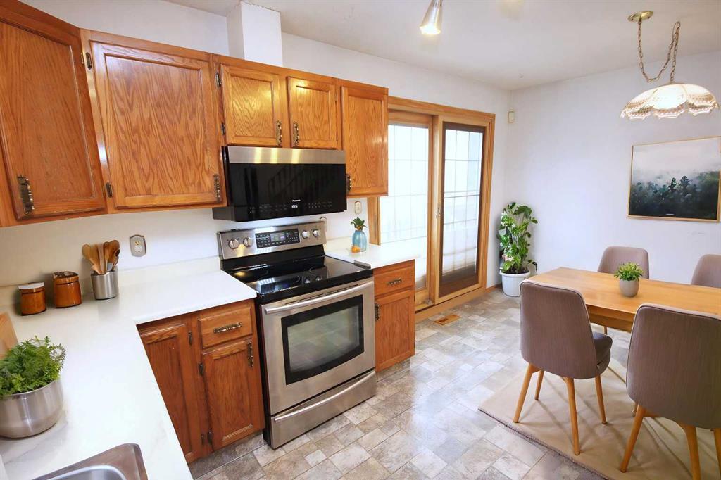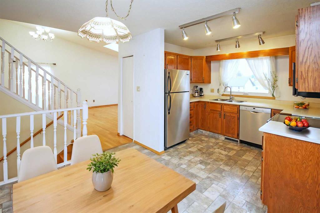 Welcome to this well maintained 4 level split home with over 1980 sq ft of living space. Upon entry, the open concept main level showcases beautiful hardwood floors in the living and dining room with vaulted ceiling that add to the grandeur and an abundance of windows and skylight allowing lots of natural light. A spacious kitchen with a second eating area has patio doors leading you out to a big front and side decks that are great for BBQing and entertaining. The hardwood continues upstairs down the hallway and into the 3 spacious bedrooms. The master bedroom has a 4 piece ensuite and another 4 piece bathroom on the upper level. On the 3rd level gather in the family room in front of the gas fireplace for game night or dancing on the corner dance floor. This level is also home to another room for your home office/play area/recreation space or guest room with a 2 piece washroom and sink area. This room gives you easy access to the back deck and yard. Fully fenced backyard has lots of room to play and relax whether lounging or entertaining on the deck or playing in the yard. The fourth lower level is developed with another room with 2 large south facing windows great for a home office. There’s laundry area and access to the attached garage on this level. As well as a huge crawl space for storage. Upgrades include: furnace (2008), windows (2014), metal roof 50 yr warranty (2008), R50 insulation (2012), deck (2009), poly-b removed (2010), fireplace gas insert (2008), skylight (2014), leaf guards (2023). Woodbine is a great community with great schools. Easy access to Stoney Tr, Fish Creek Park, Costco and close to local amenities and schools, a great place to call home!
