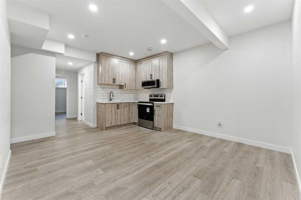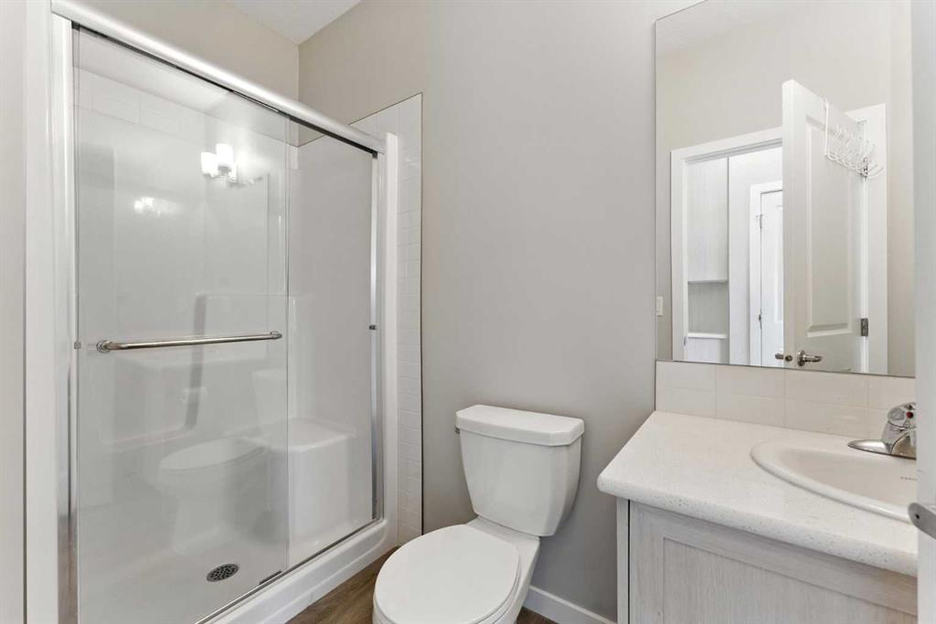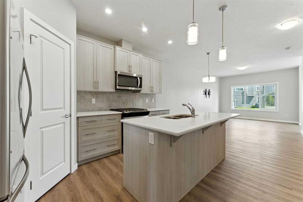 The main floor boasts a bright, open-concept layout with large windows that flood the space with natural light. The modern kitchen is equipped with stainless steel appliances, a corner pantry, and a large island with quartz countertops — perfect for hosting and everyday family living. A full-sized bedroom and a 3-piece bathroom on the main level offer a convenient option for guests or multi-generational living without the need for stairs.