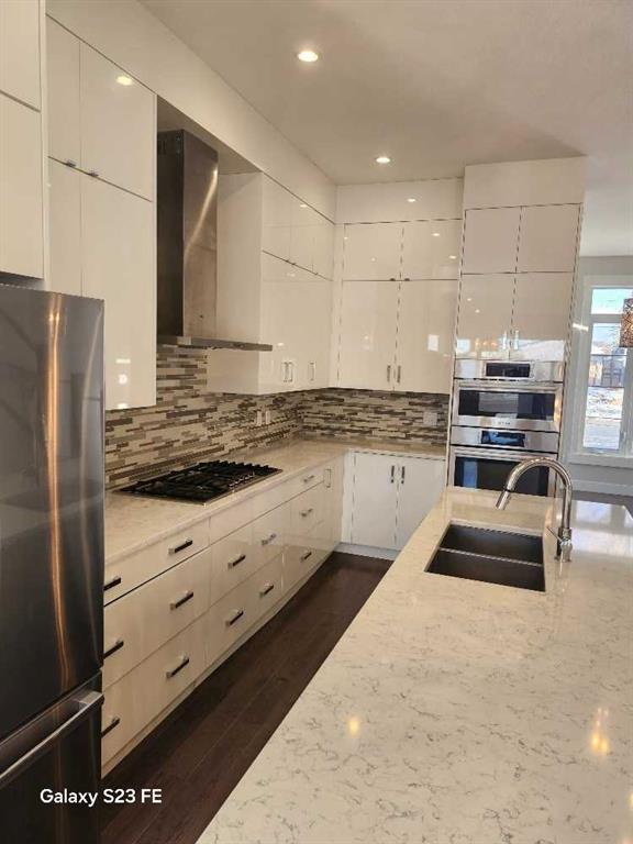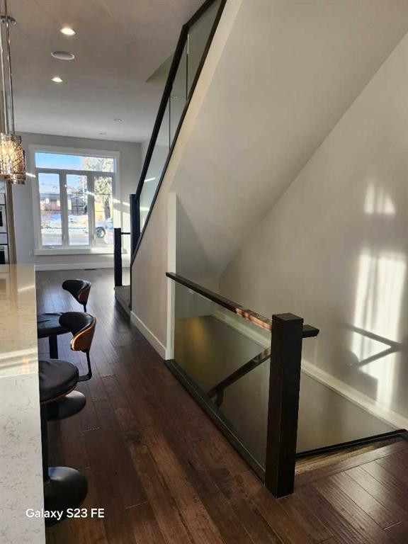 Custom built attached two storey 4 Bedroom, 3.5 baths in popular inner city Killarney. Double garage plus a gravel parking pad large enough for a 45 ft RV. Main floor engineered hardwood flooring, 10 foot ceilings with speakers and numerous recessed lighting, modern kitchen cabinetry – floor to ceiling, quartz counters including an expansive island with waterfall feature and breakfast bar, complete Bosch stainless appliances, Gas cooktop, Range Hood, SxS Fridge, built-in Microwave and wall oven, Island Dishwasher. Linear gas fireplace in living room surrounded by cabinetry, large rear mudroom and powder room. 3 spacious bedrooms upstairs, large common 4 pce bath, 3 skylights, large master bedroom with 5 pce Ensuite and walk-in closet, deep soaker tub and large glass shower, large laundry room with floor to ceiling cabinets, front load washer/Dryer and a laundry sink. The basement offers a large open media space with expansive and open wet bar, 3 pce bath with large glass shower, 1 additional bedroom and a den. Outdoors space is fully landscaped, fenced and double detached garage. An additional gravel parking space on south side of fence (approx 13 ft wide and 45 ft long)