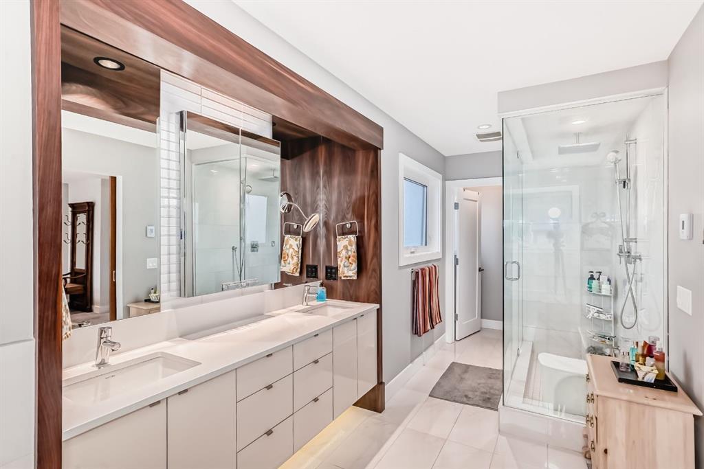 Upstairs, the luxurious primary suite offers a spa-inspired ensuite with a stunning walk-in shower (roughed-in for steam), a soaker tub, and double vanity. Heated floors are featured in all full bathrooms, adding an extra touch of comfort. The upper level also includes a beautiful skylight that enhances the bright and airy feel.