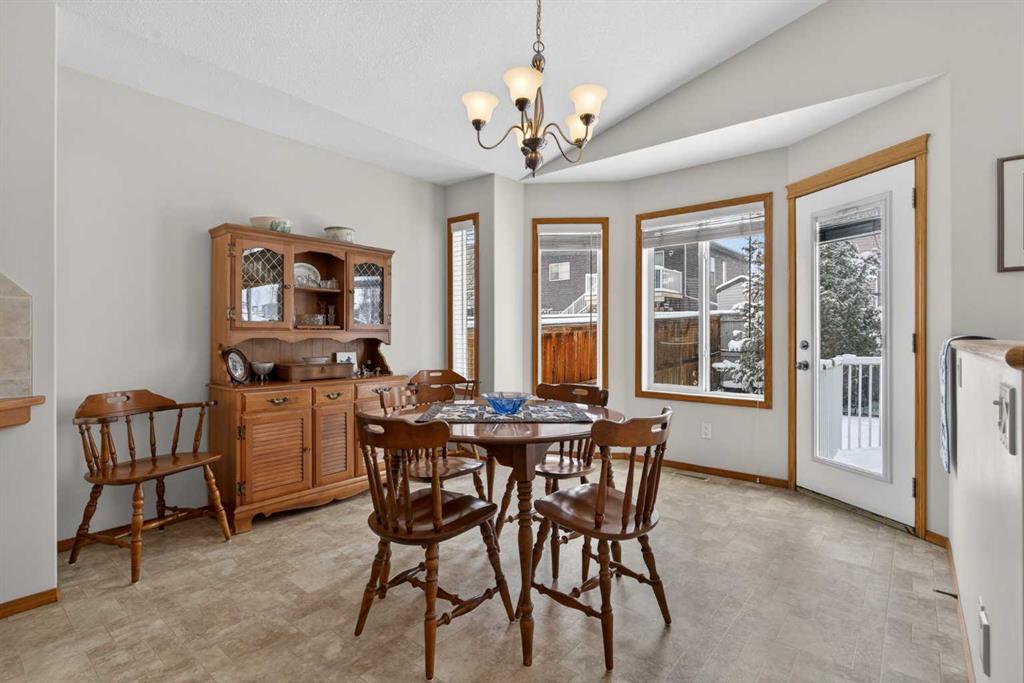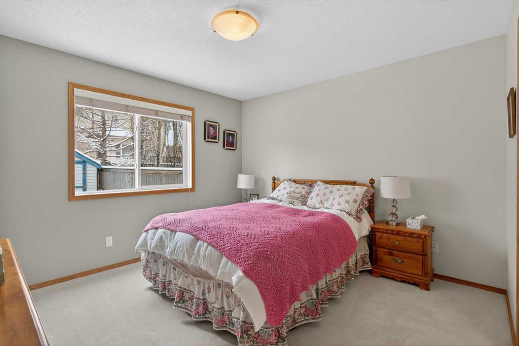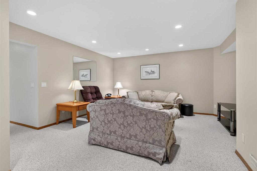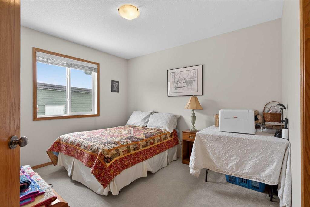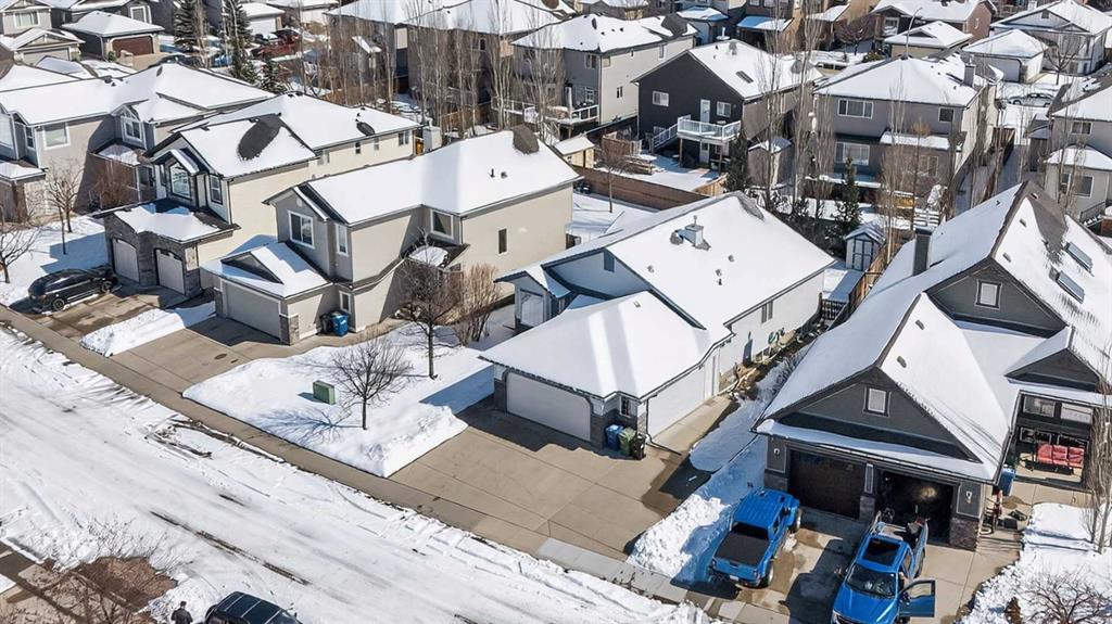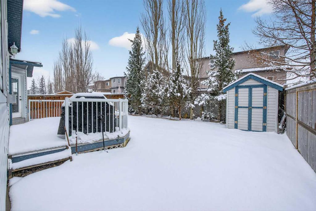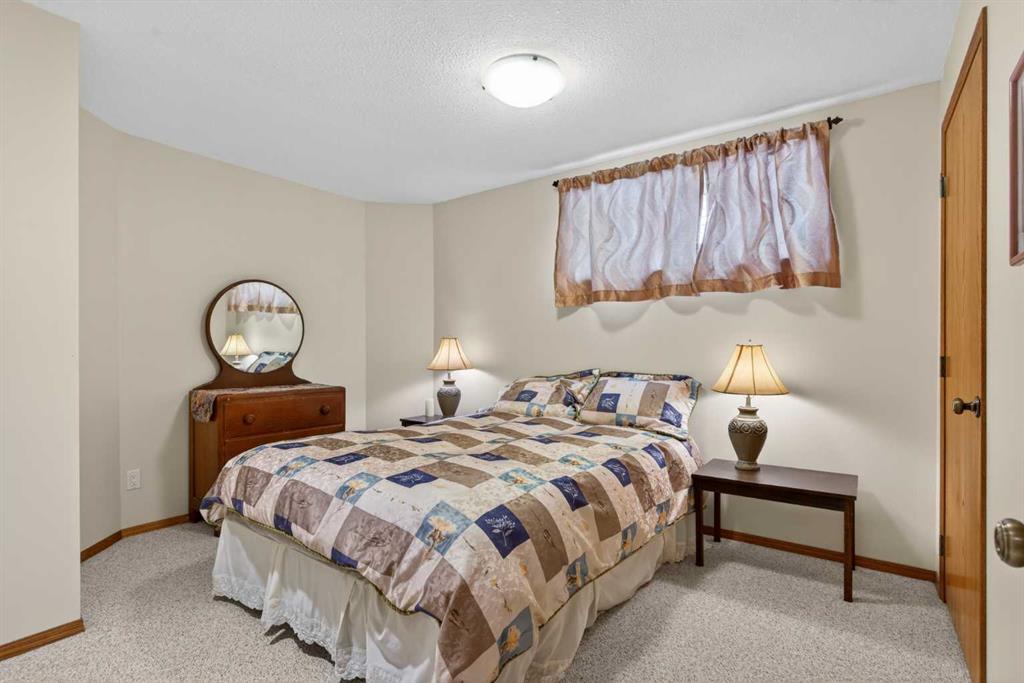 Welcome home! It’s rare to find an original owner bungalow of this size and value in Airdrie. From the moment you step into the spacious front entry, you’ll appreciate the thoughtful layout and inviting feel of this home. French doors lead you into a versatile front flex room, perfect for a home office, sitting area, or playroom, before opening into the bright, open concept main living space. The kitchen is truly the heart of the home, featuring a large eat up island, gleaming oak cabinetry with under mount lighting, select stainless steel appliances, a convenient corner pantry, and a skylight that fills the space with natural light. Just steps away, the generous family room offers a cozy gas fireplace, ideal for relaxing evenings, and large windows that overlook the backyard. The dining area flows seamlessly from the kitchen and provides direct access to the rear yard, making it perfect for entertaining. Outside, you’ll find a large deck with a natural gas BBQ hookup, a storage shed, and plenty of green space for kids and pets to enjoy. Down the hallway, you’ll find a conveniently located laundry room complete with a sink and direct access to the oversized, insulated double garage. The main floor also features a well sized second bedroom, a full four piece bathroom, and a spacious primary suite that easily accommodates a king sized bed. The primary retreat is complete with a walk in closet and a private four piece ensuite featuring a relaxing jetted tub. The fully finished lower level expands your living space with a massive recreation room, perfect for movie nights, games, or gatherings, along with two additional generously sized bedrooms, another full bathroom, and a dedicated storage area with a small workshop. Situated on a desirable, gently pie shaped lot, this home also offers a large driveway with room for two vehicles plus RV parking. Additional highlights include a high efficiency furnace and an unbeatable location, just steps from scenic walking and biking paths around the lake, within walking distance to schools, and close to shopping and everyday amenities.