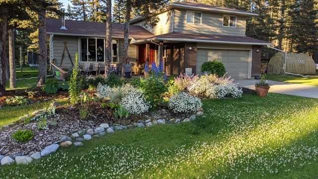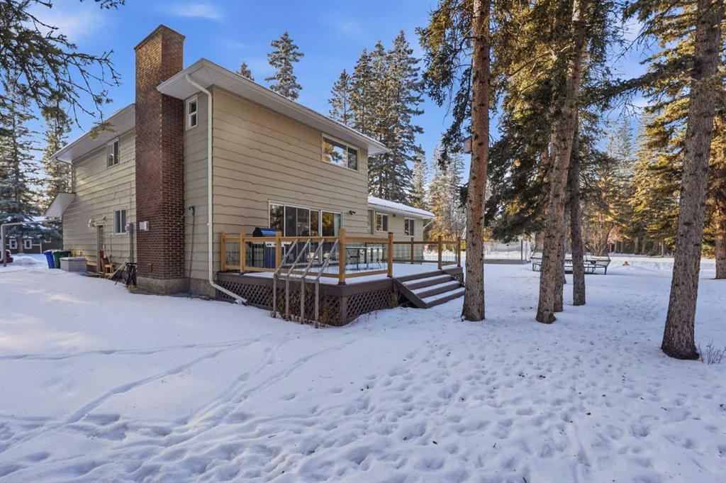 Welcome to a beautifully cared for family home nestled among the towering evergreens of Redwood Meadows where nature, space, and community come together. This inviting 2-storey residence offers over 2,500 sq ft above grade plus a fully finished basement, providing over 3,300 sq ft of developed living space on a nearly 16,150 sq ft lot. Warm and welcoming from the moment you arrive, the home features a new custom Oak front entry door and new garage door, leading inside to a thoughtfully designed layout with hardwood flooring and newer, luxuriously soft carpeting throughout. The main level offers exceptional versatility, highlighted by a sunken great room with a gas fireplace, an additional living room with a wood-burning fireplace, formal dining space, and a bright kitchen overlooking the private treed yard.