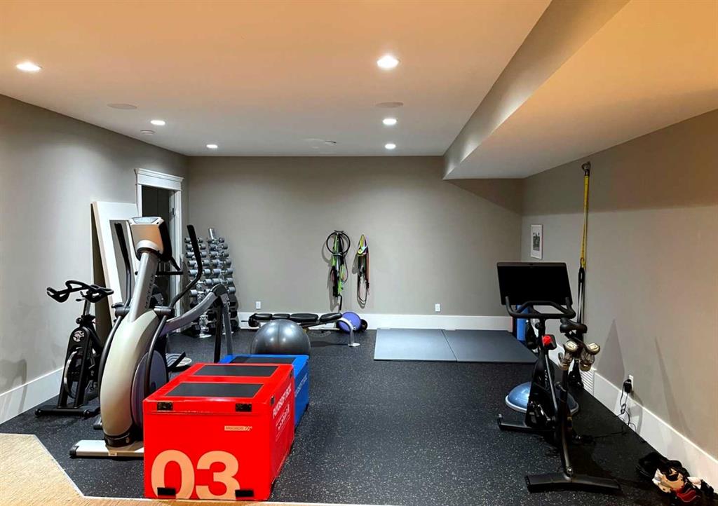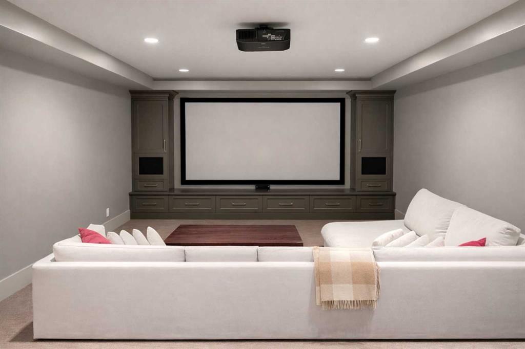 The fully developed lower level includes a high-end cinema room, expansive gym and recreation space, bar with two fridges and additional dishwasher, wine cellar, and two additional bedrooms.