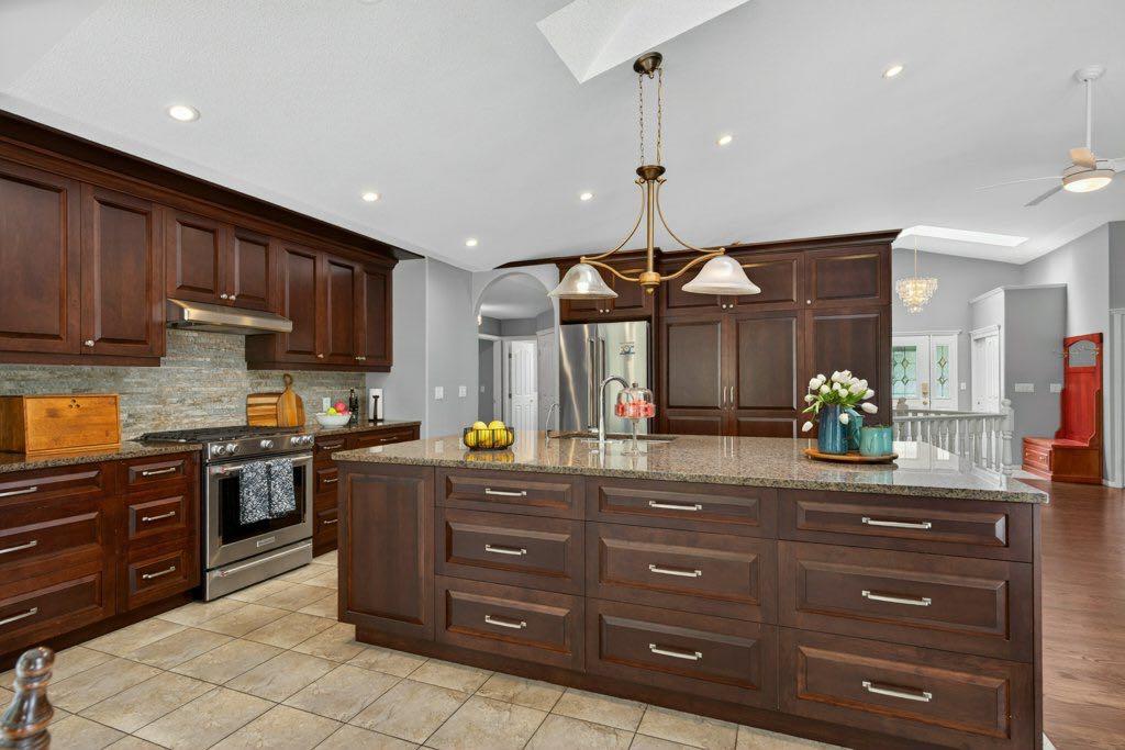 For those needing workspace or storage, the property is well equipped with a heated attached triple garage with high ceilings and room for car-lifts, a heated detached double garage/shop, and an RV parking port with electrical service. A lawn tractor with snow blower and mower attachments is also included, supporting year-round property maintenance.