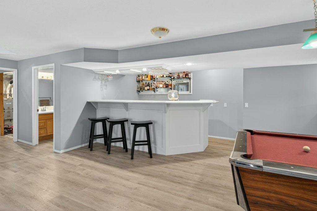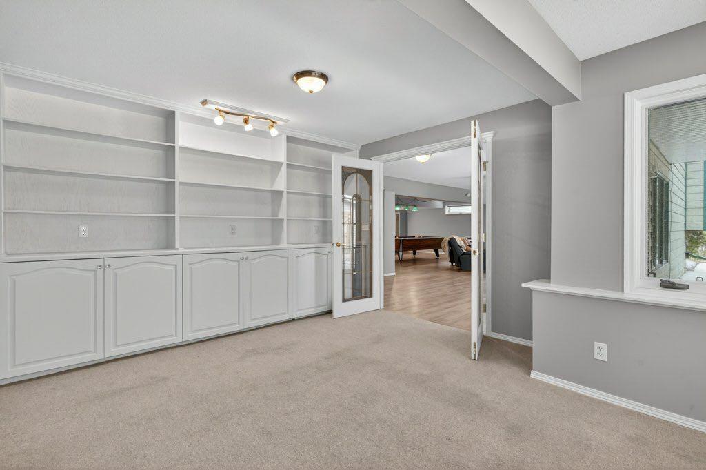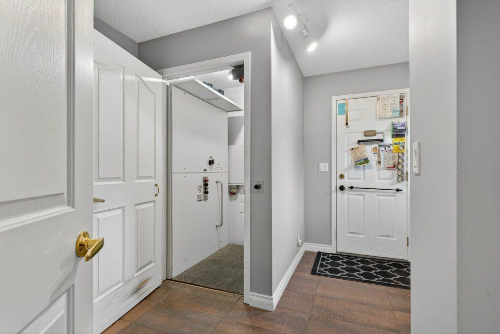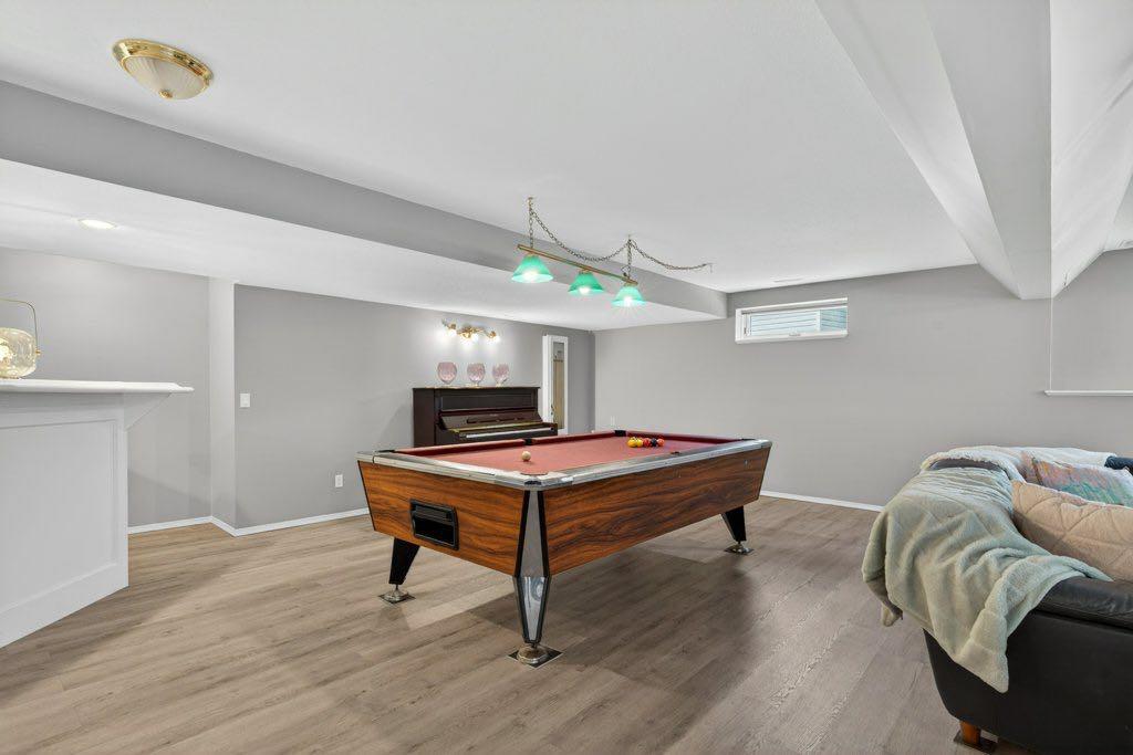 The primary suite includes an updated ensuite with in-floor heat and a curb-less shower, designed with comfort and accessibility in mind. An elevator lift connects the garage, main level, and walkout basement, offering flexibility for a variety of living needs. The lower level includes a large recreation space with a games area, a pool table (included), two additional bedrooms, and a second office that could also function as a bedroom.