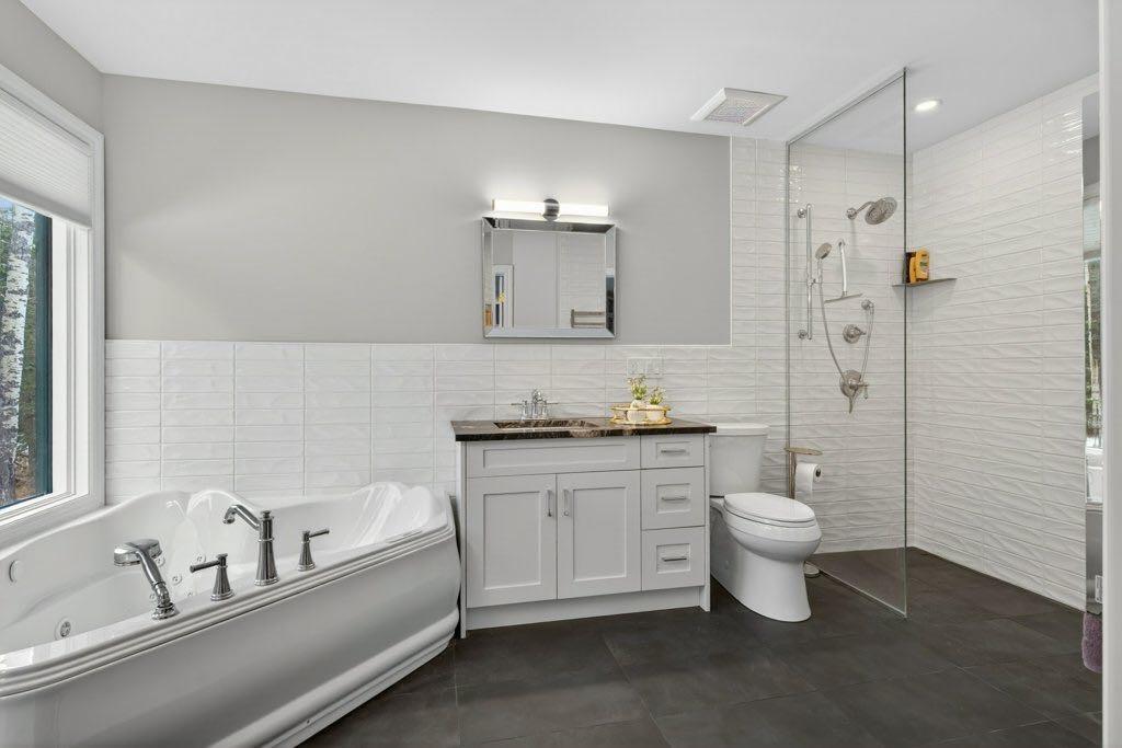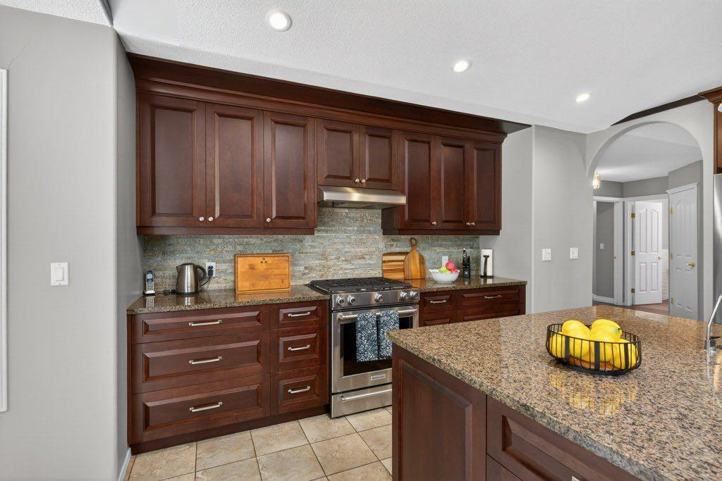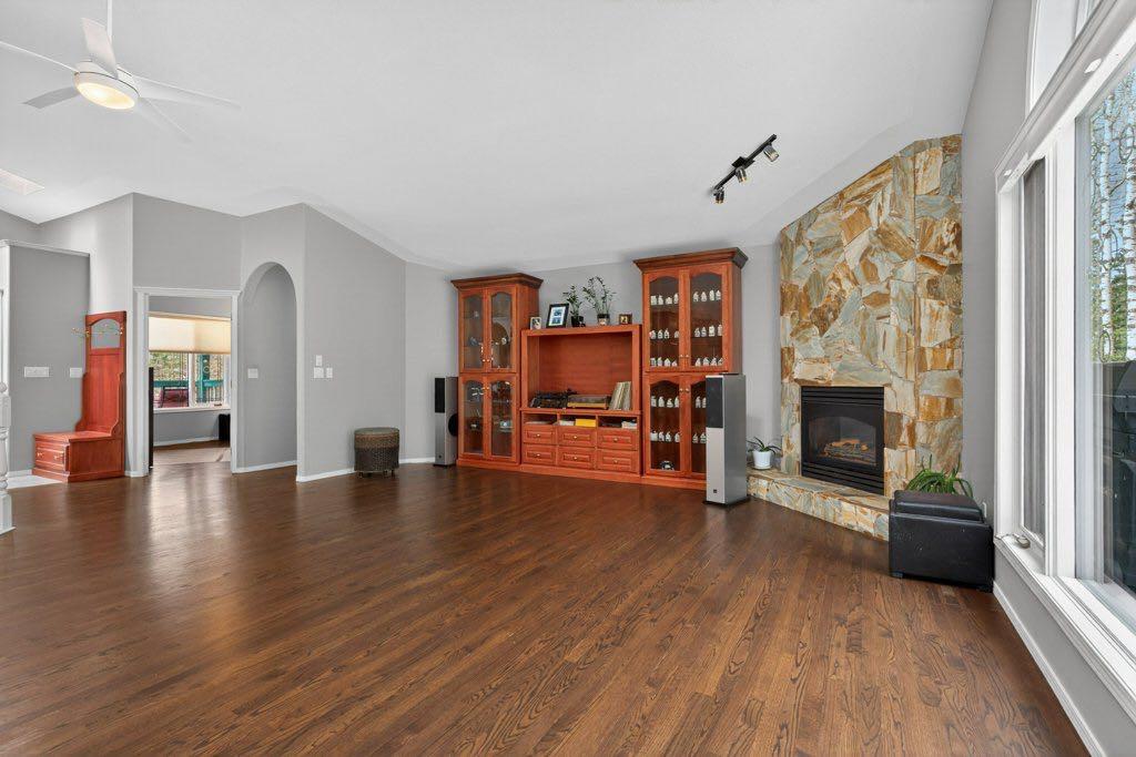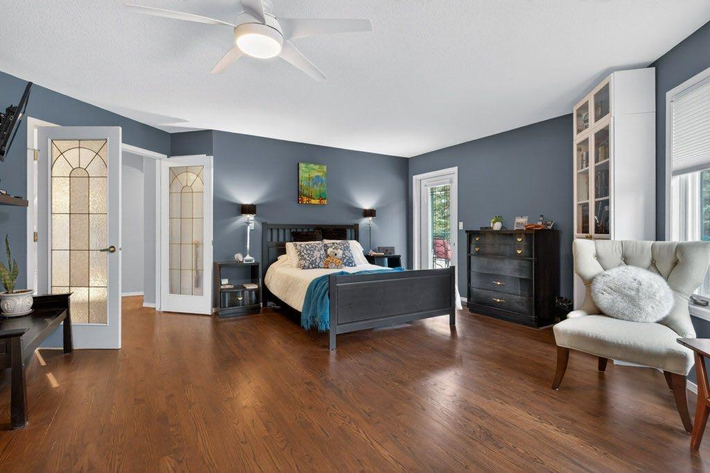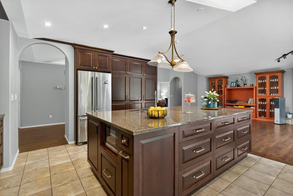 The primary suite includes an updated ensuite with in-floor heat and a curb-less shower, designed with comfort and accessibility in mind. An elevator lift connects the garage, main level, and walkout basement, offering flexibility for a variety of living needs. The lower level includes a large recreation space with a games area, a pool table (included), two additional bedrooms, and a second office that could also function as a bedroom.