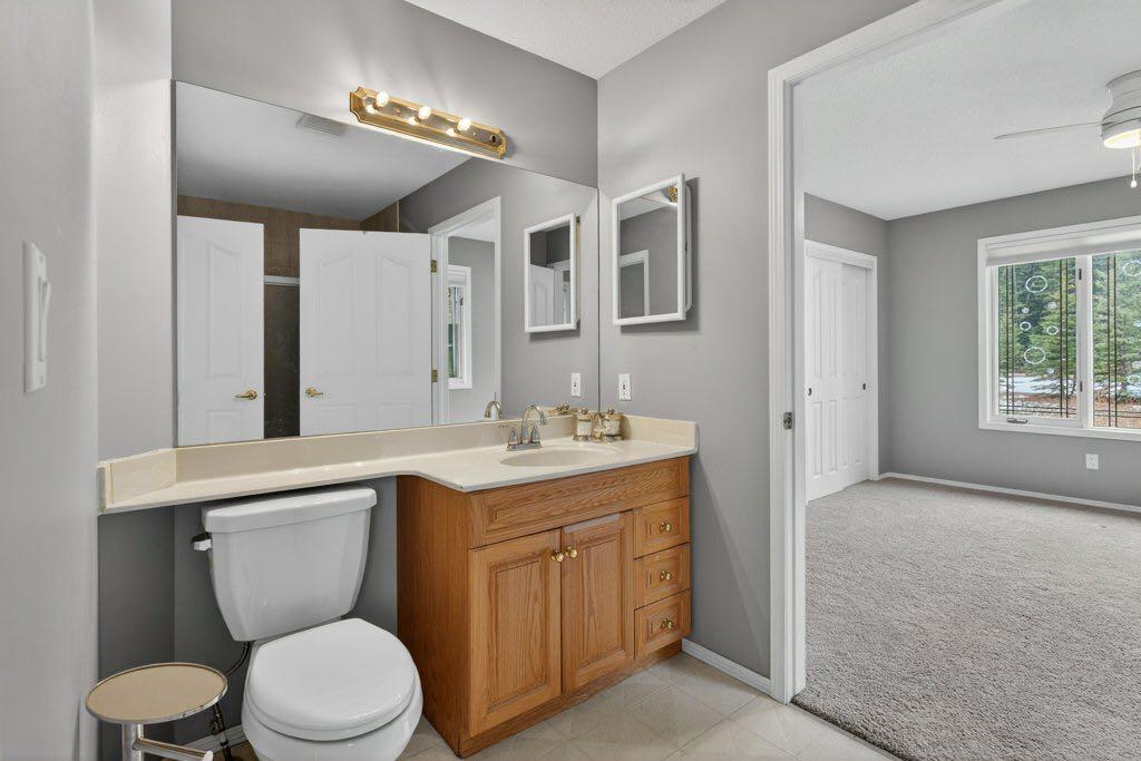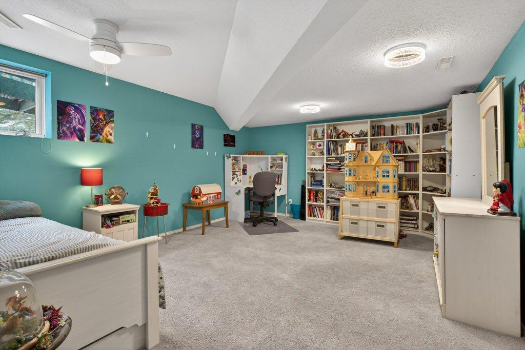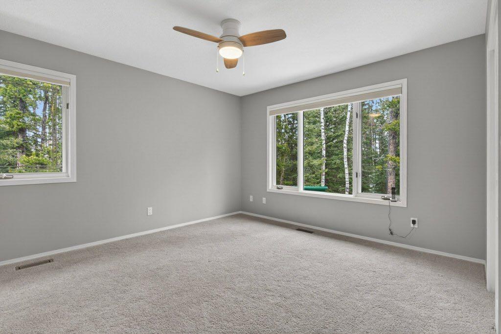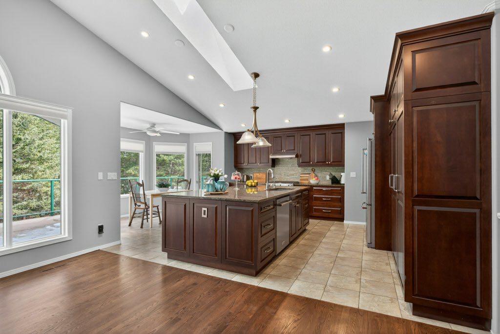 The main floor includes three bedrooms, a formal dining room, private office, and a spacious living area anchored by oak hardwood flooring and large windows that connect the home to its natural surroundings. The kitchen has been updated and provides ample storage and workspace with an island the size of, well, an island! It transitions into a breakfast nook and out to a large deck with glass railing—an ideal spot to take in the natural beauty and seasonal creek. Neutral paint throughout creates a cohesive, move-in ready feel, while Hunter Douglas honeycomb blinds add both style and efficiency.