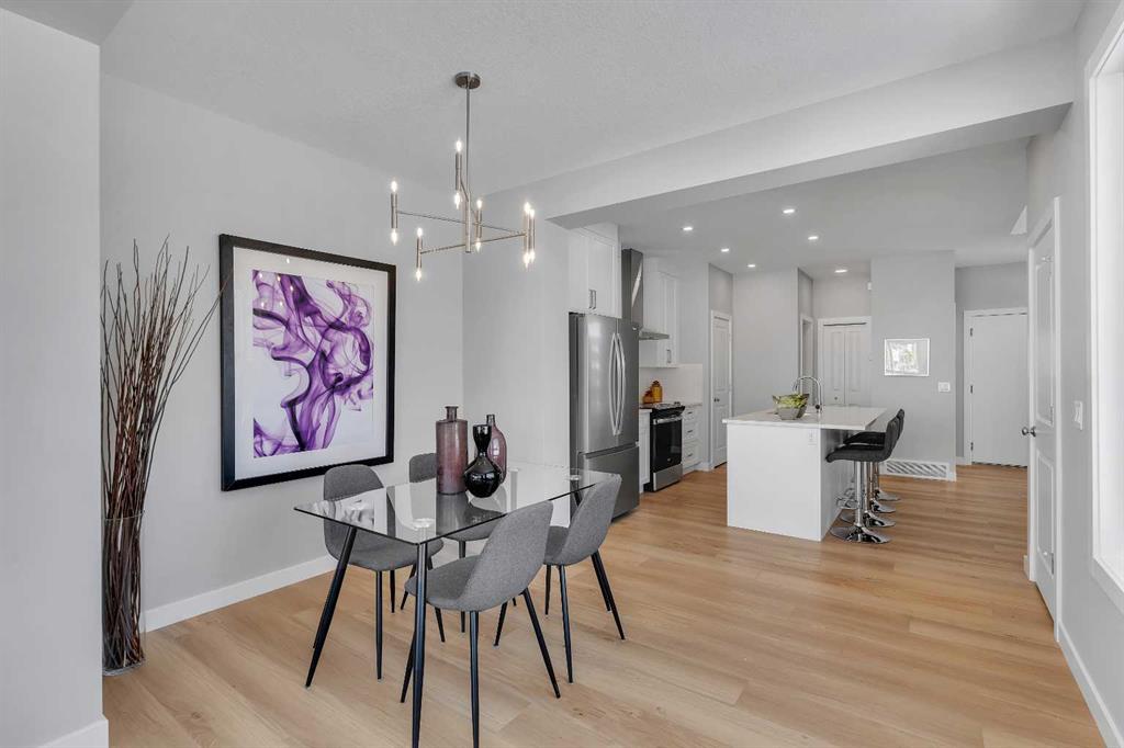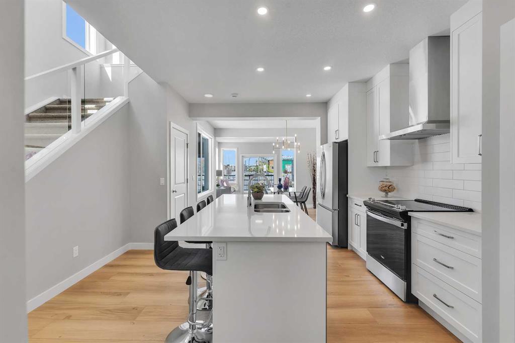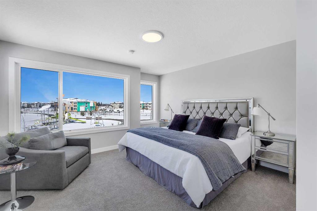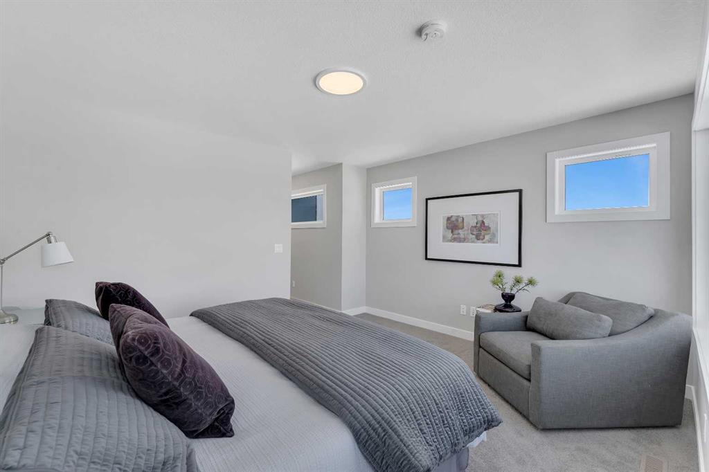 Step inside to an open-concept main floor highlighted by modern finishes and sleek glass railings. The kitchen is both functional and stylish, featuring stainless steel appliances, ample cabinetry, and a spacious island perfect for entertaining. The layout flows seamlessly into the dining and living areas, where views of the greenspace can be enjoyed from every angle. Step outside to your sunny backyard and enjoy direct sightlines to the playpark, ideal for keeping an eye on the kids. Upstairs, a central loft provides flexible space for a home office or reading nook. The primary suite is expansive, complete with a walk-in closet and a spa-inspired ensuite featuring dual sinks and an oversized shower. Two additional bedrooms, a full bathroom, and convenient upper-level laundry complete the upper floor. The basement offers a separate entry and is ready for future development to suit your needs. Located in South Shore, surrounded by estate homes, walking paths, and playgrounds, and just steps from Chestermere Lake, this community is designed for those who value both lifestyle and location.