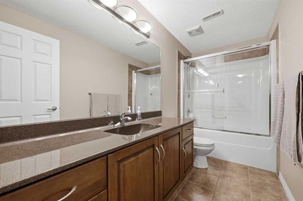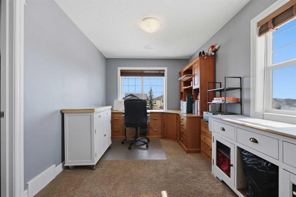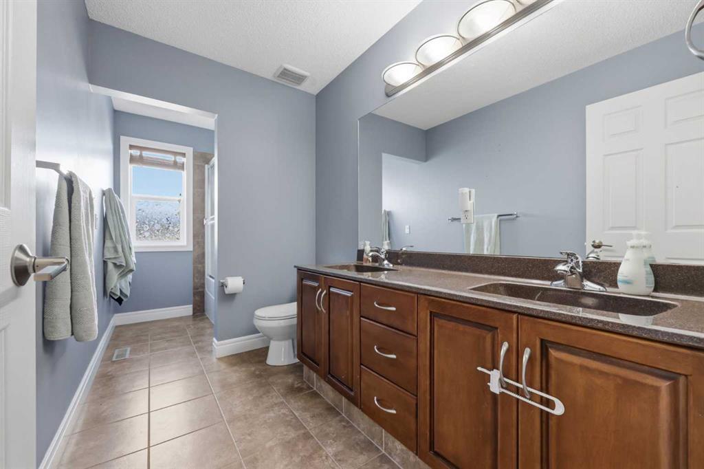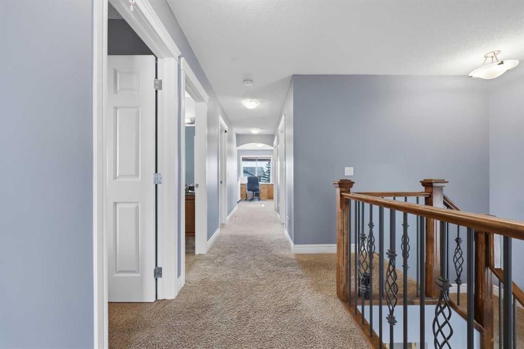 Stepping inside the front door, you’re greeted by a spacious front entry with a massive walk-in closet (a rare and genuinely useful feature), plus a dedicated main floor office. The kitchen is functional, featuring stone countertops, a large pantry, and new high-end appliances, all tied together with laminate flooring across the entire level. This home leans into entertaining, with a built-in speaker system that flows from the interior to the backyard deck. Upstairs, you’ll find FOUR generously sized bedrooms, including a primary retreat with a walk-in closet and a five-piece ensuite as well as a BONUS area and a 5-piece bath. The fully developed basement adds real flexibility—complete with a FIFTH bedroom, full bathroom, and a comfortable rec space with a wet bar and second fireplace. Central A/C, two hot water tanks, and a DOUBLE ATTACHED, HEATED garage are already in place. Located close to schools, shopping, playgrounds and pathways, with the added bonus of green space right next door, this is a solid, move-in-ready option in one of Airdrie’s most family-friendly communities.
