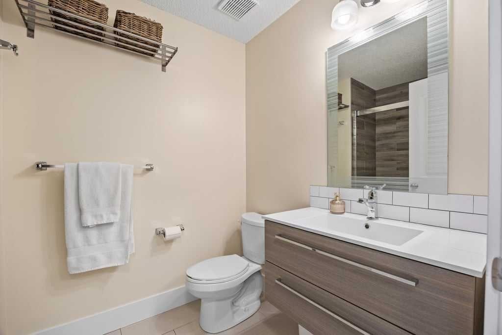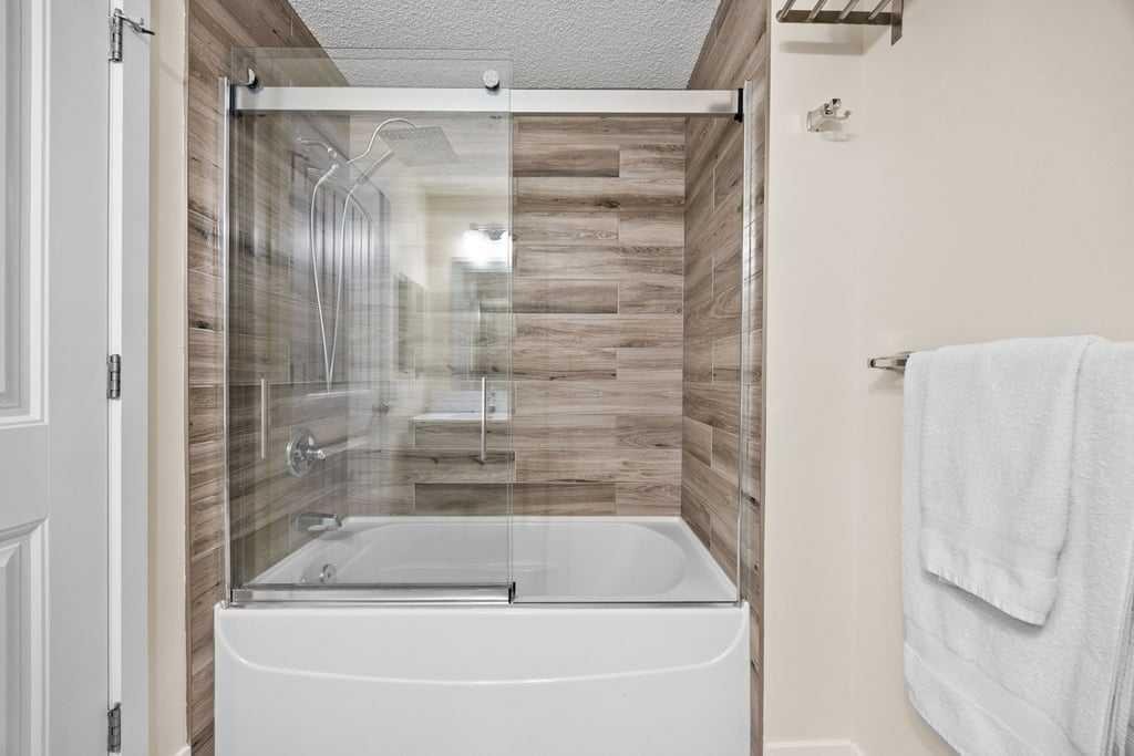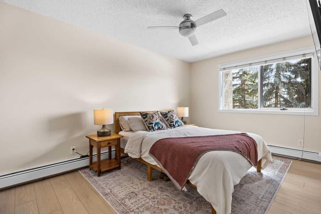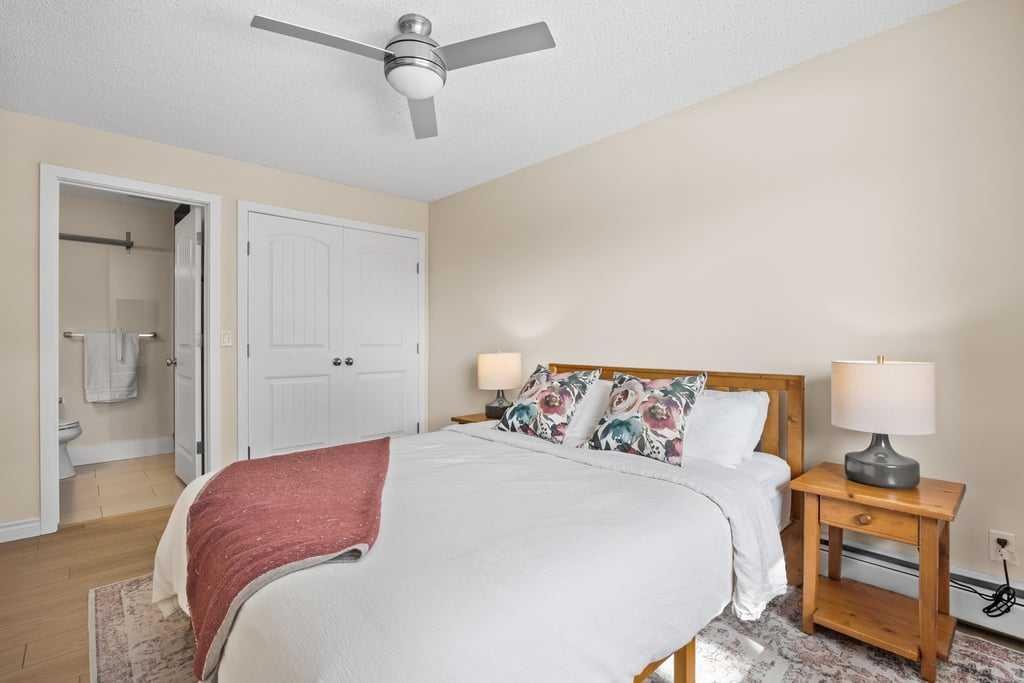Both bedrooms offer excellent storage, including a spacious primary retreat with a built-in wardrobe and private ensuite. The bathrooms have been thoughtfully renovated, offering both a full tub and a stand-up shower for added flexibility. A second full bathroom is ideally located just across from the second bedroom, making it perfect for guests or shared living.