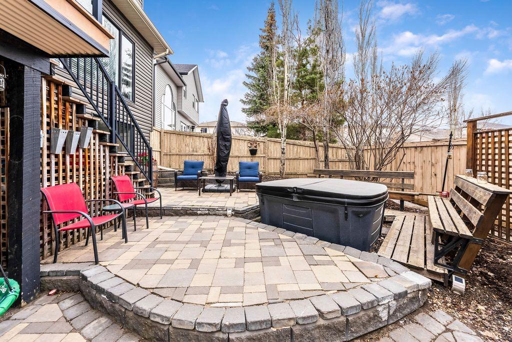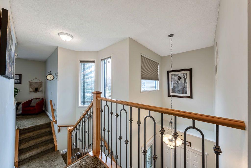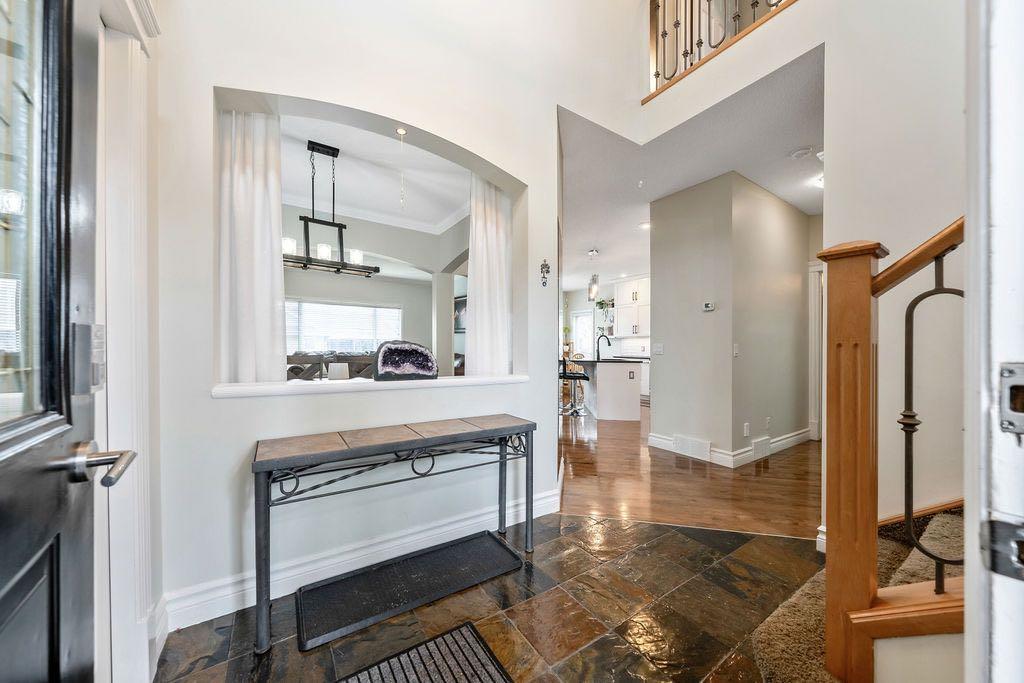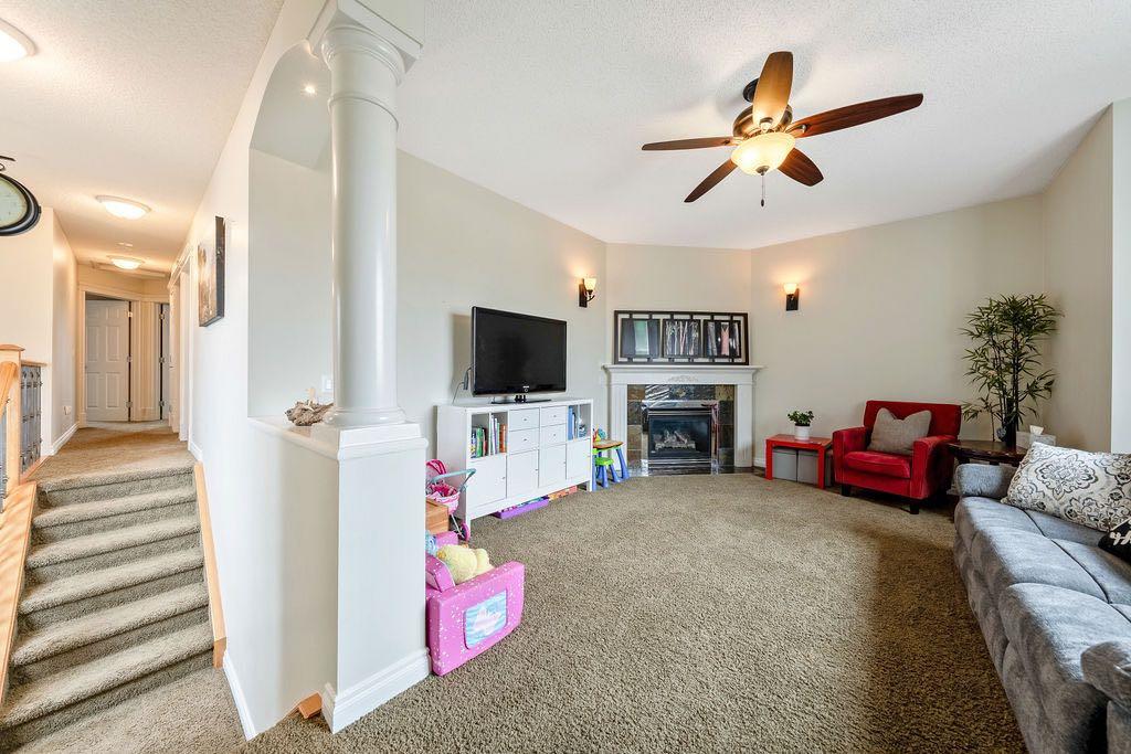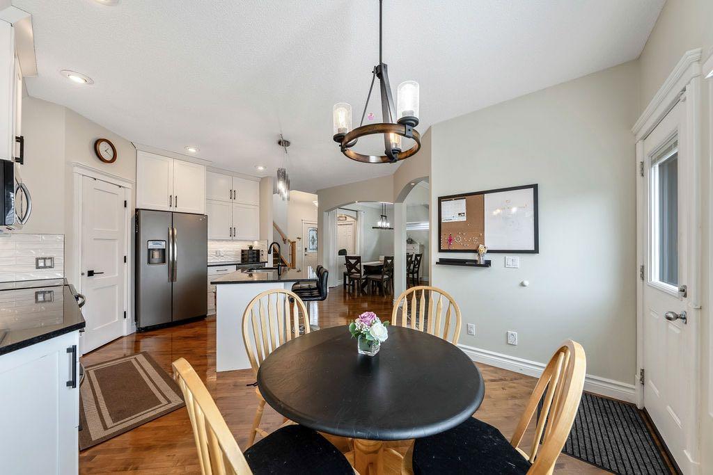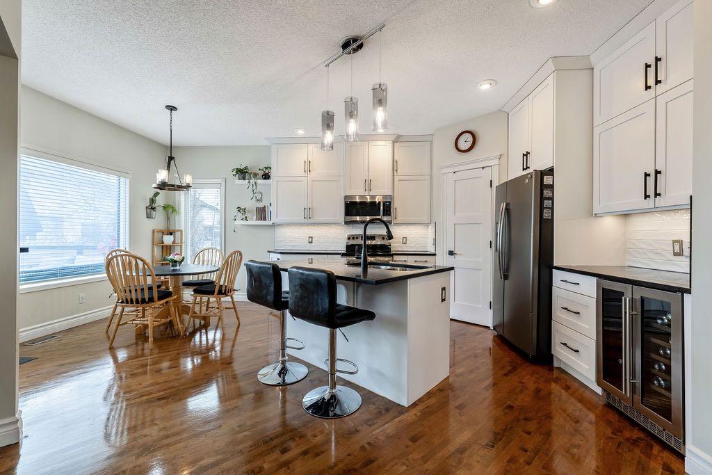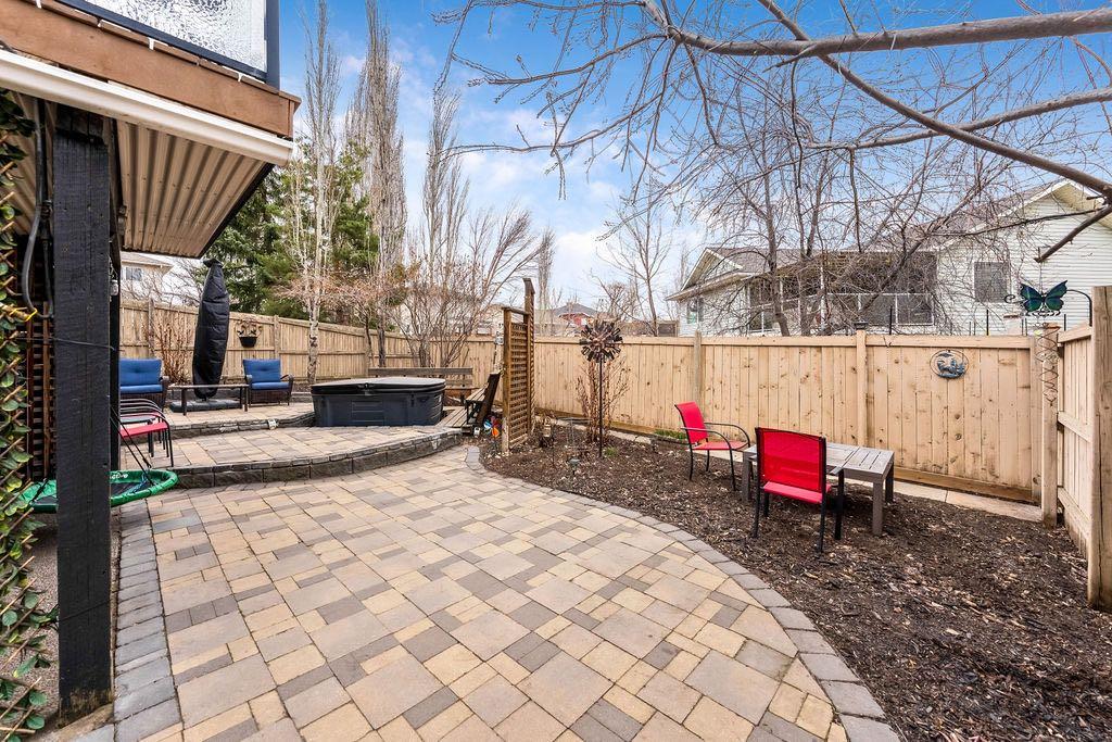 **Open House Sunday May 3rd 1pm-3pm** Welcome to this spacious and well-appointed two-storey walkout offering over 2,900 sq ft of developed living space, with seamless indoor-outdoor flow designed for real family living. Step inside to a bright and inviting main floor featuring hardwood flooring, 9’ ceilings, and elegant archways that blend open-concept flow with defined living spaces. The renovated kitchen offers white cabinetry, black granite countertops, stainless steel appliances, a corner pantry, central island, and beverage fridge—perfect for busy family life. A sunny breakfast nook opens onto the upper deck, making outdoor meals and gatherings easy. The main floor also includes a cozy living room with gas fireplace, formal dining area, laundry, ½ bath, and access to the double attached garage with 8’ door for larger vehicles. Upstairs, you’ll find three well-sized bedrooms, including a primary retreat with walk-in closet and a 5-piece ensuite with freestanding tub. A large bonus room with a second gas fireplace provides the ideal space for movie nights, playtime, or simply relaxing together at the end of the day. The fully developed walkout basement adds even more flexibility with a fourth bedroom, full bath, wet bar, storage, and a generous recreation area with a third gas fireplace—perfect for teens, guests, extended family or home business. Step outside to a beautifully landscaped, tiered backyard with extensive stonework, multiple seating areas, and a private hot tub—creating a space the whole family can enjoy. Located in an established community close to parks, pathways, shopping, and within walking distance to multiple schools, this home offers the space, comfort, and everyday convenience growing families are looking for.