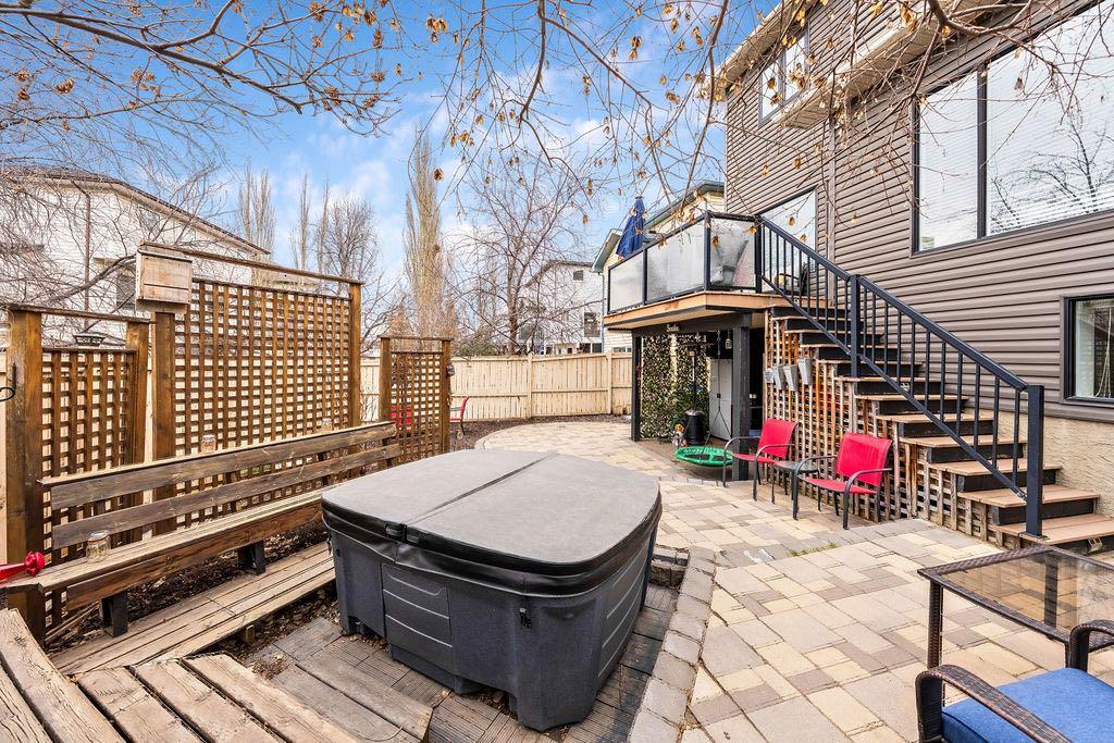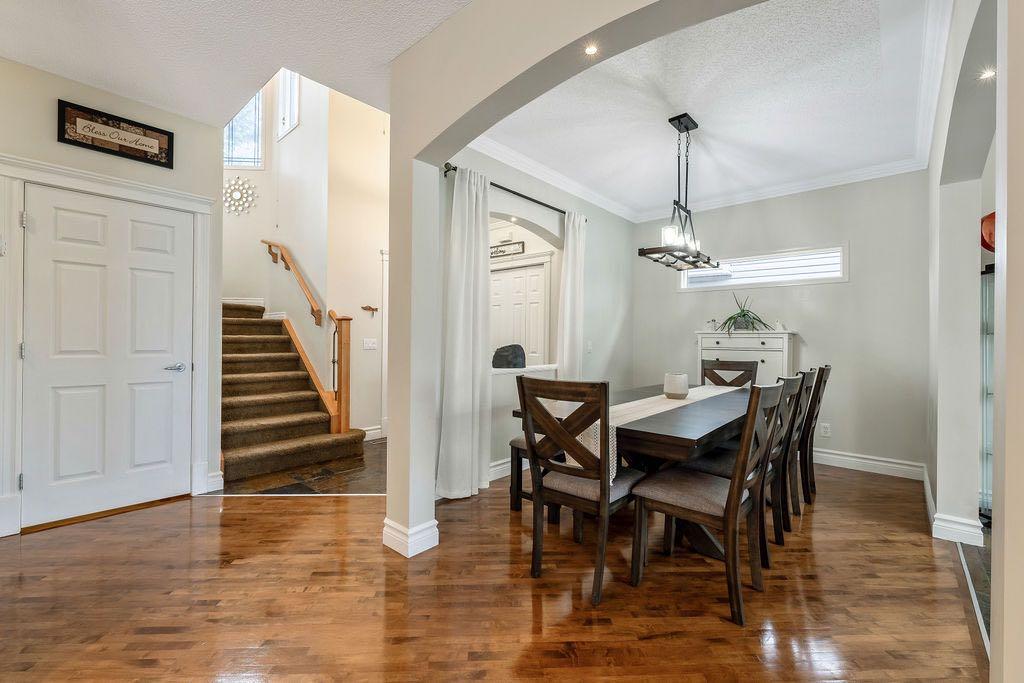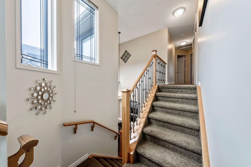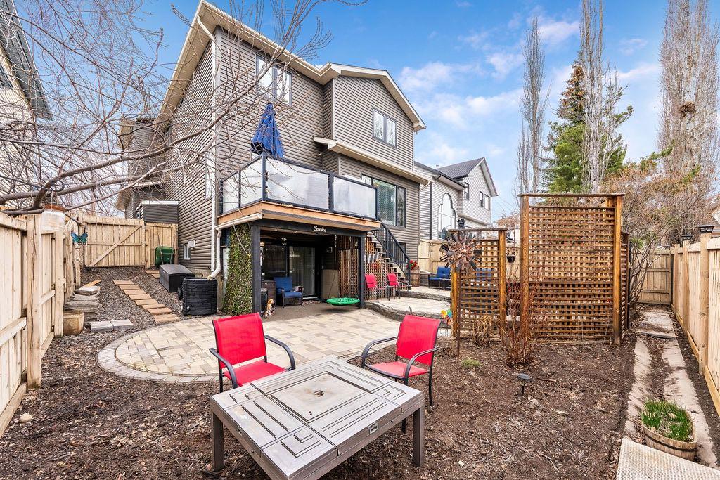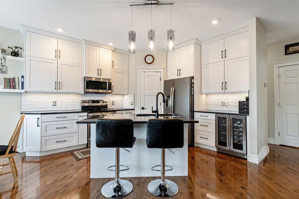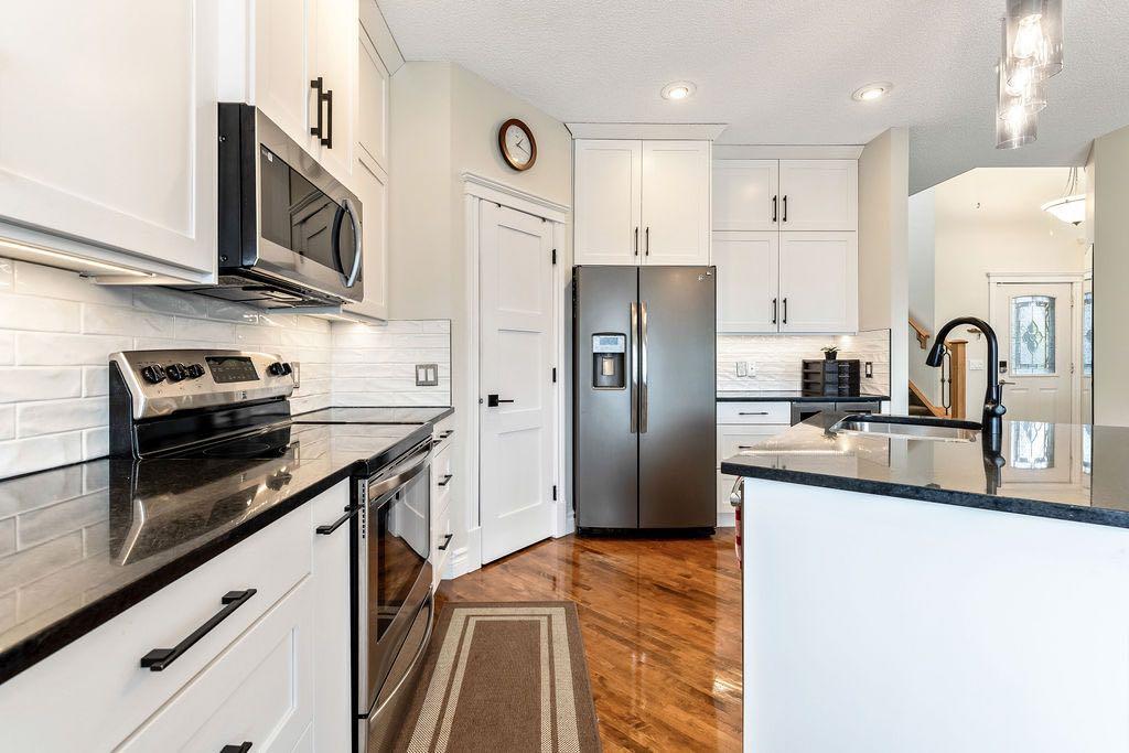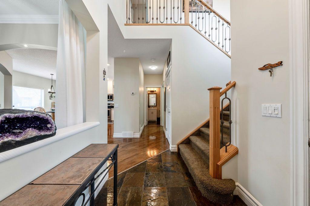 **Open House Sunday May 3rd 1pm-3pm** Welcome to this spacious and well-appointed two-storey walkout offering over 2,900 sq ft of developed living space, with seamless indoor-outdoor flow designed for real family living. Step inside to a bright and inviting main floor featuring hardwood flooring, 9’ ceilings, and elegant archways that blend open-concept flow with defined living spaces. The renovated kitchen offers white cabinetry, black granite countertops, stainless steel appliances, a corner pantry, central island, and beverage fridge—perfect for busy family life. A sunny breakfast nook opens onto the upper deck, making outdoor meals and gatherings easy. The main floor also includes a cozy living room with gas fireplace, formal dining area, laundry, ½ bath, and access to the double attached garage with 8’ door for larger vehicles. Upstairs, you’ll find three well-sized bedrooms, including a primary retreat with walk-in closet and a 5-piece ensuite with freestanding tub. A large bonus room with a second gas fireplace provides the ideal space for movie nights, playtime, or simply relaxing together at the end of the day. The fully developed walkout basement adds even more flexibility with a fourth bedroom, full bath, wet bar, storage, and a generous recreation area with a third gas fireplace—perfect for teens, guests, extended family or home business. Step outside to a beautifully landscaped, tiered backyard with extensive stonework, multiple seating areas, and a private hot tub—creating a space the whole family can enjoy. Located in an established community close to parks, pathways, shopping, and within walking distance to multiple schools, this home offers the space, comfort, and everyday convenience growing families are looking for.